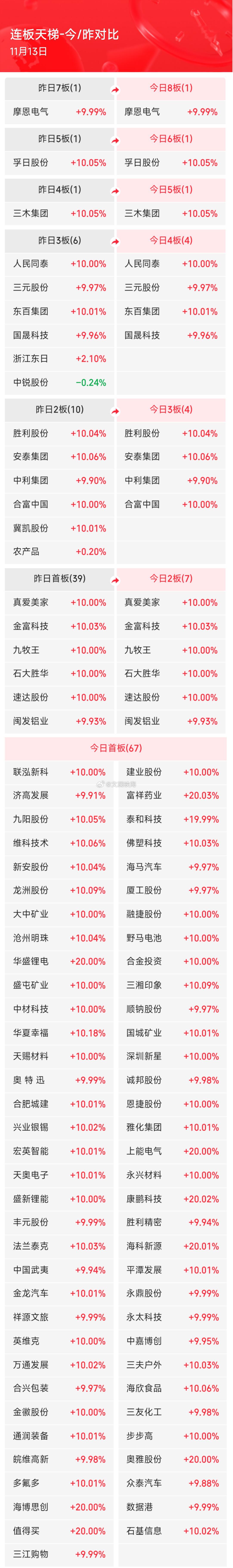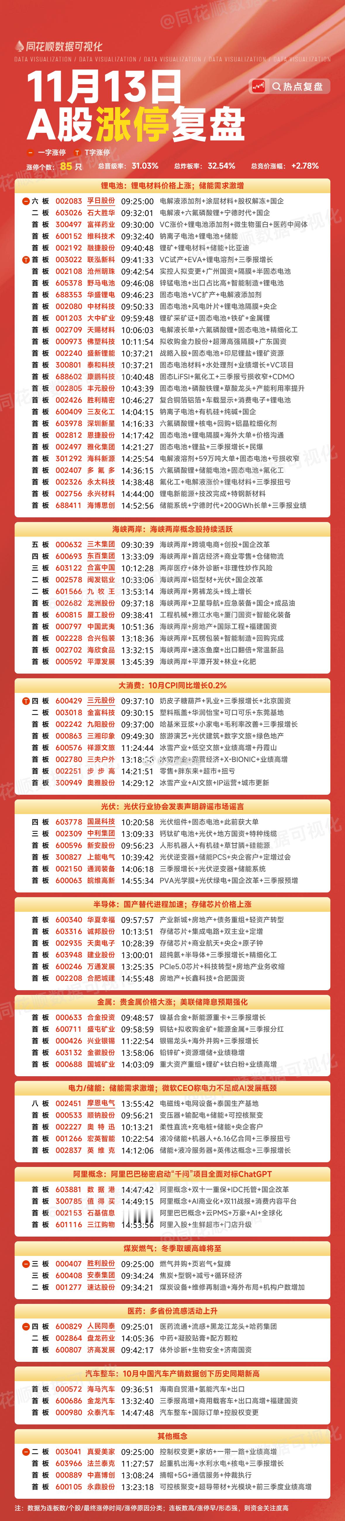 11月13日涨停复盘:85股涨停,锂电池与消费板块领涨今日沪深两市共85只个股涨停,热点覆盖锂电池、海峡两岸、大消费、光伏、半导体、电力电网等多个方向。市场主线以大科技与稀土永磁为代表的结构性题材持续震荡整理,连板梯队保持完整,短线情绪活跃。8连板:摩恩电气6连板:孚日股份5连板:三木集团4连板:国晟科技、人民同泰、浙江东日、东百集团3连板:合富中国、百川能源、安泰集团、胜利股份、中利集团等2连板:石大胜华、真爱美家、金富科技、速达股份、闽发铝业、盘龙药业、九牧王等首板股:建业股份、海马汽车、盛新锂能、盛屯矿业、华盛锂电、华夏幸福、厦工股份、多氟多、三夫户外、数据港、值得买、步步高、三江购物、恩捷股份、天赐材料、合肥城建、野马电池、胜利精密等从涨停结构看,锂电池板块延续强势,多只锂电材料与资源股涨停;大消费方向在零售、电商等细分领域表现活跃;高位连板股持续拓展空间,短线资金围绕主线热点展开梯度布局。