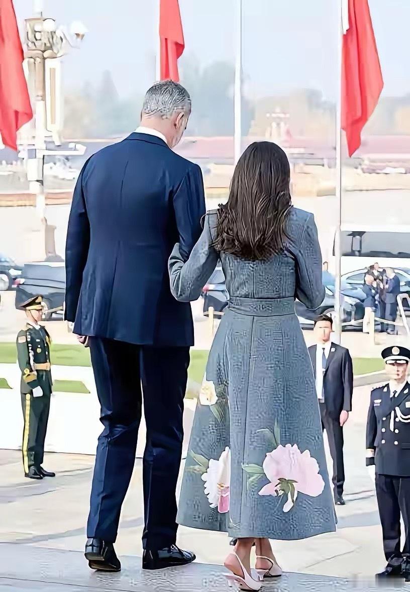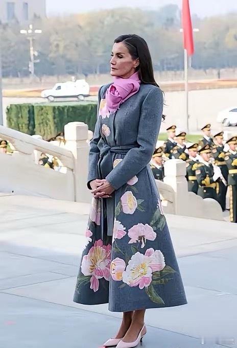 西班牙王后在北京出席欢迎仪式,有个细节不知道大家发现没?感觉莱蒂齐亚王后,应该也是知道最近北京的气温有点低,所以看到她身穿了一件灰色印有牡丹花的风衣,脖子上还戴着一条粉色围巾,不过让人费解的是,她的脚上却穿着一双露脚后跟的鞋子,而且连双袜子也没有穿,相当于是光着脚丫子了,真的很好奇在北京这么冷的气温下,她就一点也不觉得脚冷吗?