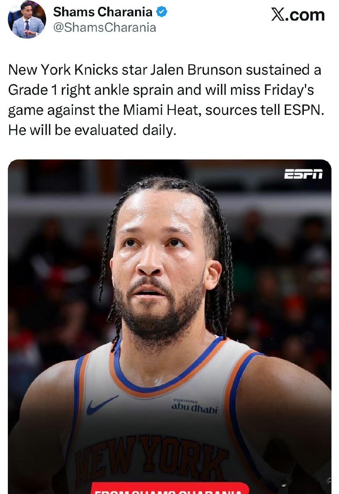 铁人也倒下了!!!布伦森右脚踝一级扭伤,将缺阵一段时间! 根据记者Shams最新消息透露,尼克斯当家球星布伦森在和魔术队的比赛中受伤了,经过赛后检查,大头遭遇了右脚踝一级扭伤,将缺阵一段时间。 本周六的NBA杯赛他肯定是打不了了,后面得每天观察情况后再确定能否出战,尼克斯境况也不好,昨天输了比赛后掉到了东部第三。 第三名看似还是一个不错的成绩,尤其是在东部,但是少了布伦森以后,尼克斯的比赛更是凶多吉少,战绩可能会直线下滑,周六主场打热火就是验证他们实力的时候了。 祝大头早日康复,加油! 布伦森 布伦森困境