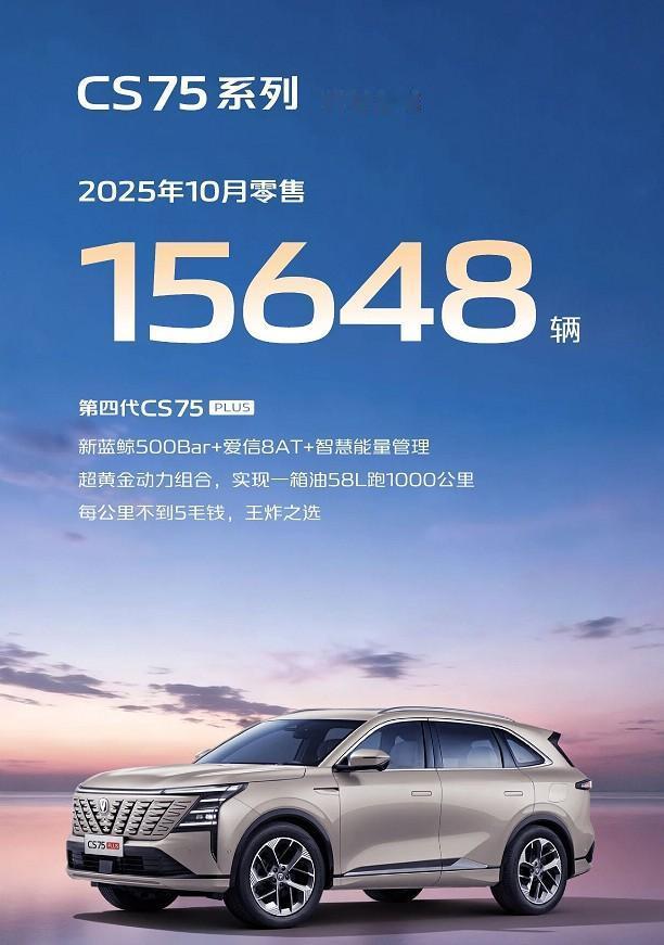 10月销量15648辆。CS75系列是经久不衰。 CS75系列,现在在售车型有第四代CS75plus,第三代CS75冠军版,CS75PRO等。价格从7.19万-13万区间。 这款车主打的大空间,性价比,舒适性等。 第四代CS75plus搭载1.5T+8AT,2.0T+8AT的黄金动力组合。