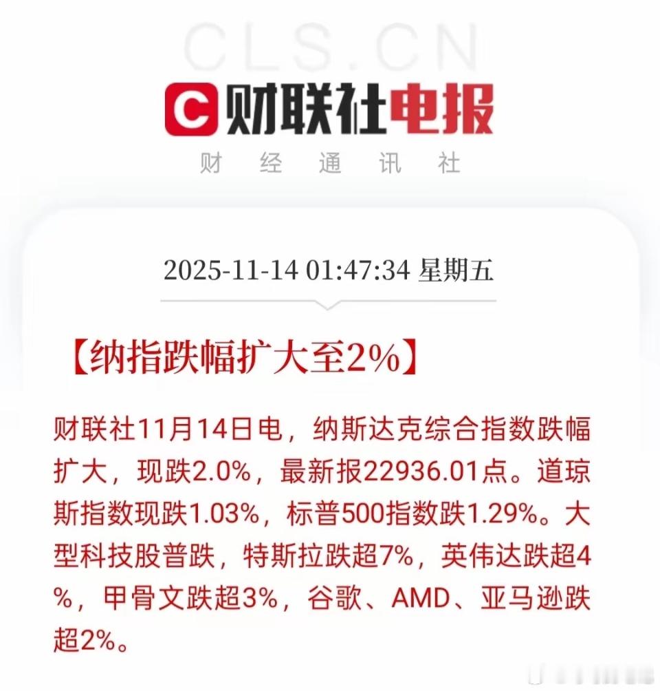 隔夜美股惊魂:AI龙头领跌,多板块承压,降息预期降温成“导火索”一觉醒来,隔夜美股的暴跌行情让人直呼“心惊”——以英伟达为代表的AI龙头集体遭遇做空冲击,市场整体表现低迷,多个关键板块与资产价格同步下探。具体来看,此次下跌态势相当显著:1. AI巨头英伟达单日跌幅达4%,作为板块风向标,其走势直接拖累市场情绪;2. 同为科技领域的博通跌幅更深,当日下跌5%,科技板块整体承压;3. 特斯拉股价波动更为剧烈,盘中最大跌幅一度触及7%,最终收跌6%,成为下跌阵营中的“重灾区”;4. 指数层面同样不容乐观,纳斯达克综合指数跌幅持续扩大,最终跌破2%关口;5. 标普500指数与道琼斯工业平均指数也未能幸免,双双下跌1.5%,美股三大指数集体走弱。更令人意外的是,这场下跌潮还蔓延至加密货币市场,比特币当日同步下跌2%;就连此前表现尚可的纳斯达克中国金龙指数,也从早盘的红盘状态翻绿,最终收跌1.6%,投资者资产账户普遍面临缩水压力。回顾此次市场动荡,“降息预期降温”被认为是关键推手——市场对美联储后续降息的时间与幅度预期减弱,流动性宽松预期收紧,这一变化对高估值科技股、成长股冲击尤为明显,最终引发了这场跨板块的集体下跌。