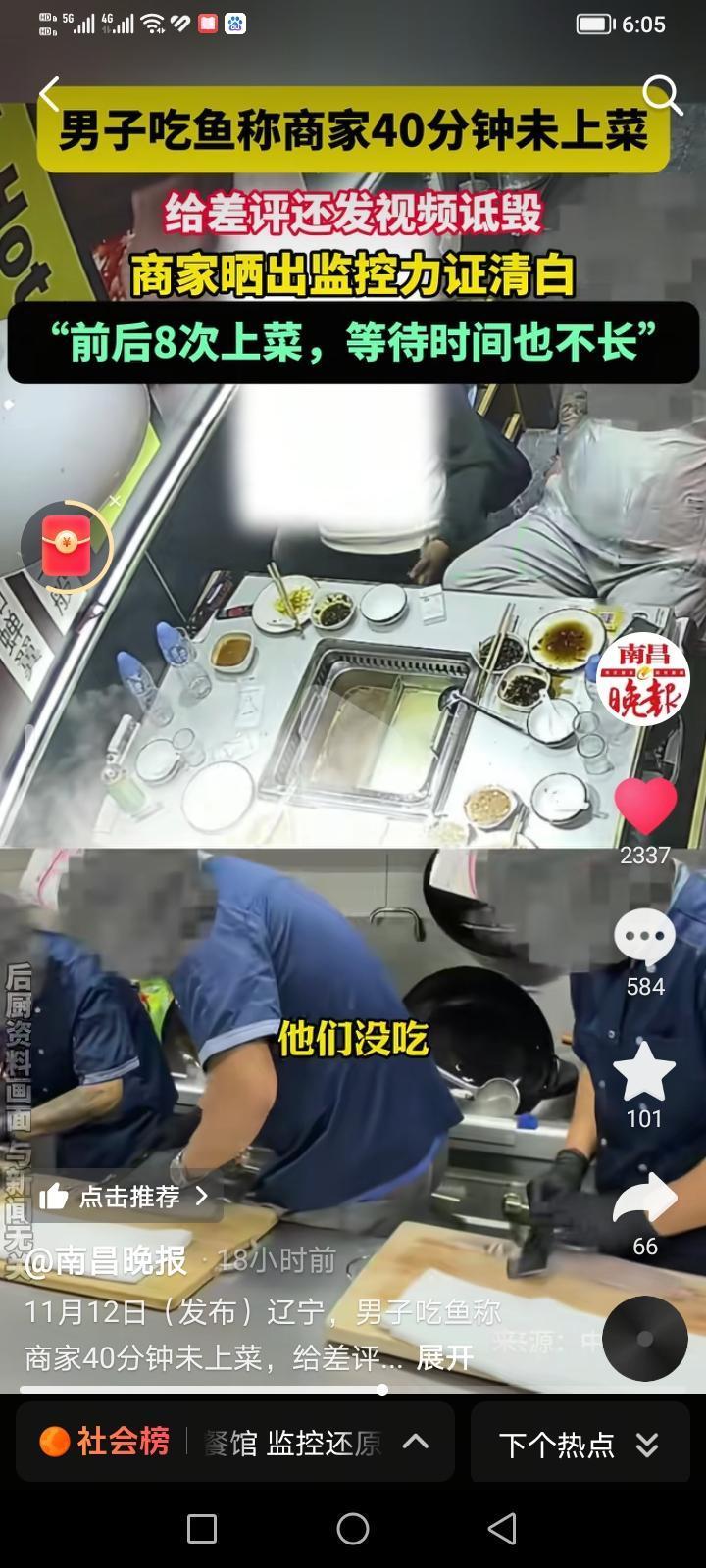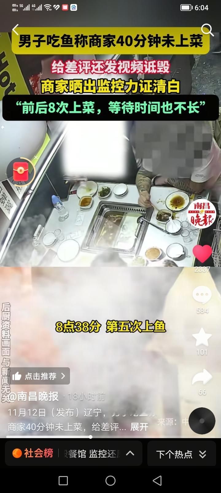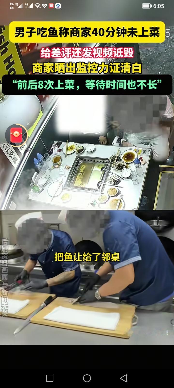 现在的人为流量有多恶心吧,抹黑商家,录视频恶意吐槽还给人差评。 11月3日晚8点18分该男子进店落座,之后他发视频吐槽自己苦等40分钟一盘鱼都没上,还指责商家看他脾气好欺负他,此前他还写了差评,甚至找人批量给商家刷差评。 商家为自证调取监控,画面显示男子落座3分钟后就上锅上鱼,后续到9点16分又先后7次上鱼,期间共8次上菜。而且男子一行人没吃这些鱼,还把鱼让给了邻桌,他录制吐槽视频时,距离入座还不到1小时,所谓40分钟没上鱼纯属虚构。 商家最初发布的监控视频被该男子以未打码侵犯肖像权为由举报下架,之后商家处理视频后再次发布,彻底还原了事件真相。真的是现在医疗技术太好,什么妖魔鬼怪都给生下来。(图片信息来源:南昌晚报)视频 吐槽某些人 网红博主的吐槽 黑心网红商家 黑粉恶评
