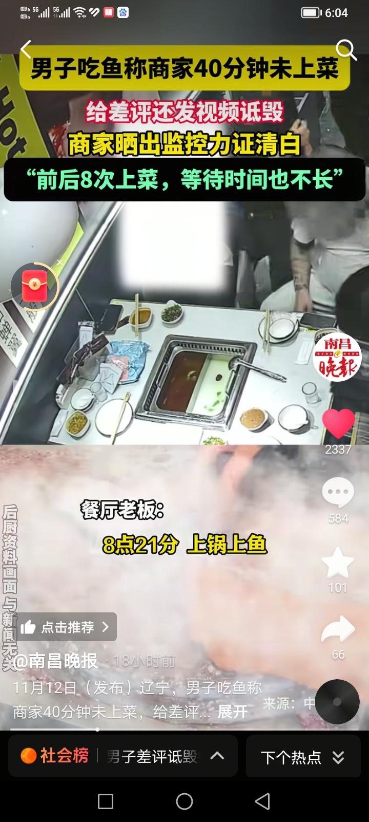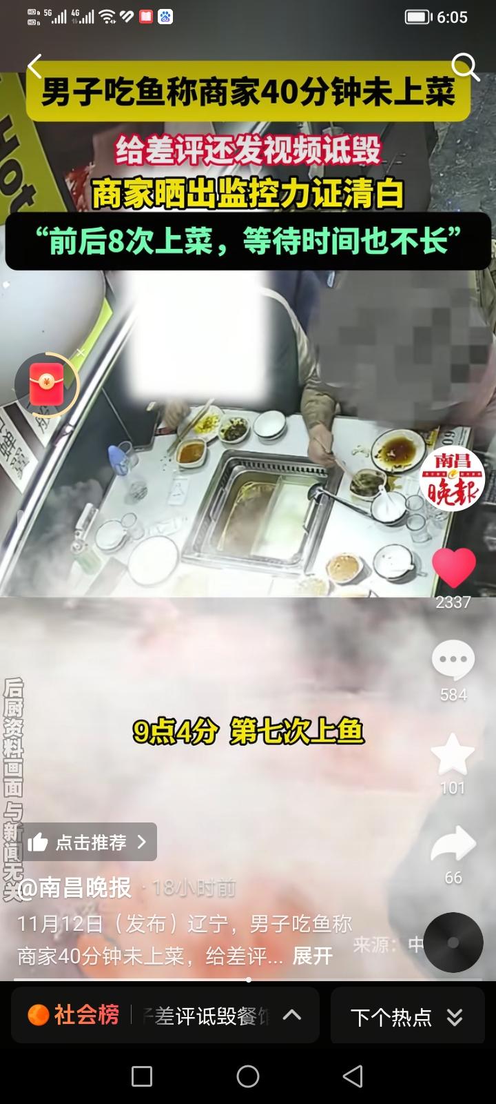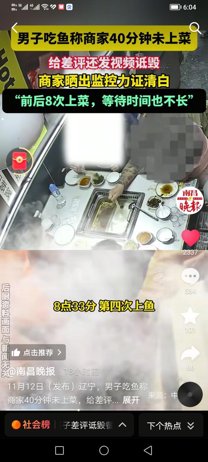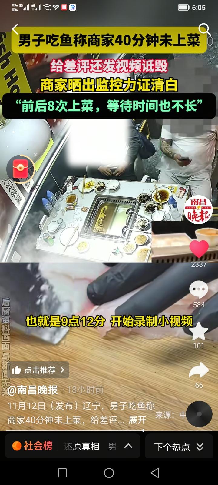 现在的人为流量有多恶心吧,抹黑商家,录视频恶意吐槽还给人差评。 11月3日晚8点18分该男子进店落座,之后他发视频吐槽自己苦等40分钟一盘鱼都没上,还指责商家看他脾气好欺负他,此前他还写了差评,甚至找人批量给商家刷差评。 商家为自证调取监控,画面显示男子落座3分钟后就上锅上鱼,后续到9点16分又先后7次上鱼,期间共8次上菜。而且男子一行人没吃这些鱼,还把鱼让给了邻桌,他录制吐槽视频时,距离入座还不到1小时,所谓40分钟没上鱼纯属虚构。 商家最初发布的监控视频被该男子以未打码侵犯肖像权为由举报下架,之后商家处理视频后再次发布,彻底还原了事件真相。真的是现在医疗技术太好,什么妖魔鬼怪都给生下来。(图片信息来源:南昌晚报)视频 吐槽某些人 网红博主的吐槽 黑心网红商家 黑粉恶评