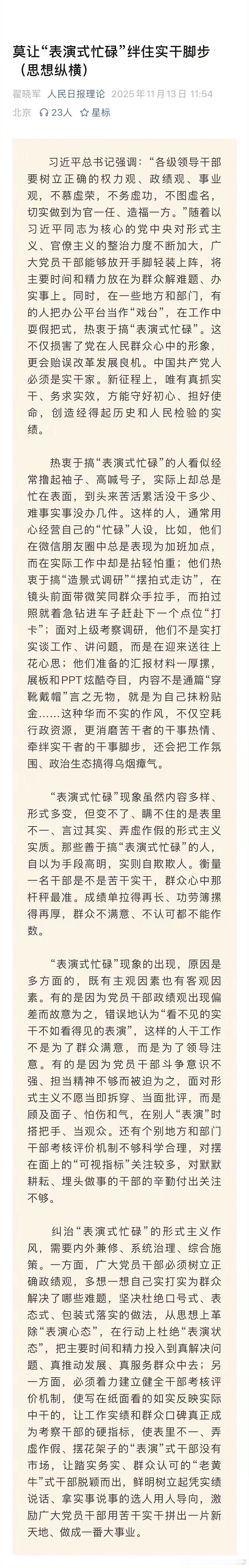 党报严厉抨击“表演式忙碌”。知耻是改变的开始!
