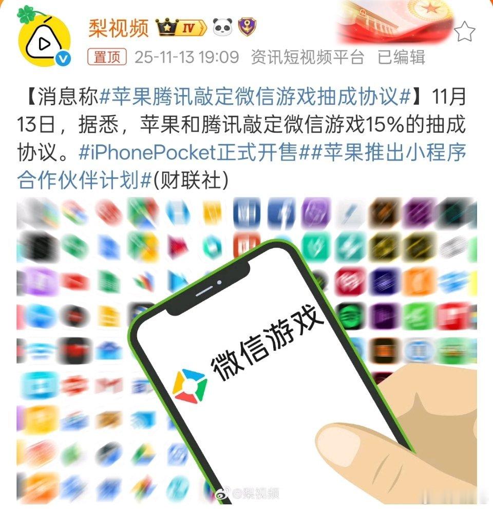 这个就是当时所谓的苹果税,本来是30%的,现在谈到15%,双方各退一步。后续用苹果手机玩游戏充值什么的估计要比安卓的贵,当然不是总说苹果的软件质量高吗?为此买单吧。