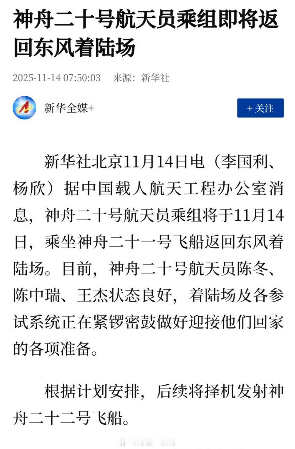 从出征时的壮志凌云到归来时的圆满成功,航天员们在太空中圆满完成了多项科学实验与技术验证任务,展现了中国航天人卓越的专业素养和无畏的探索精神。此次任务的顺利完成,不仅进一步提升了我国航天技术的国际影响力,也为后续深空探测奠定了坚实基础。每一次成功都离不开无数科研人员的默默付出,向所有为中国航天事业奋斗的人们致敬!