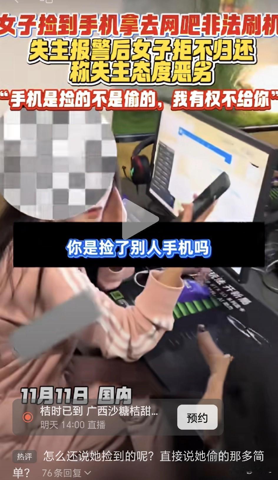 “是我捡的,不是偷的!”女子网吧强刷苹果机,警察带失主上门反被怼:你去起诉!我捡的有权利不给! 11月11日,广东,网友的苹果手机不慎丢失,被人捡走。 网友赶紧借朋友手机给自己的苹果手机多次拨打电话,均无人接听。报警后,哪怕警察打电话,女子都拒绝归还。 后利用手机定位功能,查到丢失手机的位置是一所网吧内。 当网友和警察找到网吧时,发现自己的手机正连着数据线,而电脑屏幕上赫然是刷机界面,捡手机的女子正在试图给苹果手机非法刷机,清除里面的数据。 当警察问女子是不是捡到了别人的手机时,女子依然很淡定,反问怎么了。 当失主说自己有证据可以证明手机是自己的,并指责女子拒不归还还非法刷机时,女子反而很理直气壮,说“是我捡的,不是我偷你的!” 并且指责失主的态度不好,说之前警察打电话自己以为是诈骗。 到了网吧外面,女子仍然坚持手机是自己捡的,不是偷的。 警察劝女子说,“既然手机是对方的,就还给对方了。” 女子却反问,“然后呢?” 随即指责,“这手机是我捡的,不是我偷的,你们为什么这个态度对我?既然是我捡的,我就有权利给,也有权利不给!” 当听到失主说,可以告她侵犯他人财物时,女子一把夺走警察手里的手机,大声喊到,“你去起诉!要不你好好说话,要不你去起诉,我无所谓的。” 那个理直气壮的态度,真是让小编佩服的五体投地! 事情最终的处理结果暂未可知,但是女子捡到手机拒不归还并非法刷机的行为,已经构成了犯罪! 根据《民法典》规定,拾得遗失物应当返还权利人,拒不归还构成不当得利,造成损失的需承担赔偿责任。若手机内数据因刷机丢失,拾得者需对失主的经济损失负责。 就想说,“我在马路边捡到一分钱,把它交到警察叔叔手里边。”从小唱到大的儿歌,难道都是唱给别人听的吗? 自己涉嫌违法了,居然还能这么理直气壮的讲自己的行为,丝毫未觉着自己有什么不对的地方。 捡到手机第一时间,不是想办法联系失主,却跑去网吧试图非法刷机,这不纯的动机已经昭然若揭。 当警察都找上门了,还不赶紧认错归还,祈求失主不追究责任。竟然说因为是自己捡的,所以自己有权利不归还? 这么些年是怎么长大的?这一点法律常识都不懂吗? 女子的行为已经不单单是道德问题,而是触碰了法律红线。 民事责任:捡到手机拒不归还,涉嫌不当得利!试图非法刷机,涉嫌侵权! 行政责任:她强词夺理、拒不配合的行为,可能被认定为寻衅滋事。苹果手机价值较大,从警察手里抢手机,严重了说,涉嫌侵占! 这位女子的“理直气壮”是建立在“无知”和“无畏”之上的。 她大概觉着无论是失主还是警察都不会为了一部手机而较真,对她都是束手无策的。 但她没有想到,她的行为不仅不会让她得到手机,反而可能让她背上案底,付出远比一部手机价值高得多的代价。 这位女子真是 “赔了夫人又折兵”,典型的 “贪小失大”,手机没捞着,反而可能要面临法律的制裁。 信息来源于广州新闻电台,侵联删! 带定位晒今日生活 我的今日状态:😁轻松愉快 我这里的天气:☀️晴天