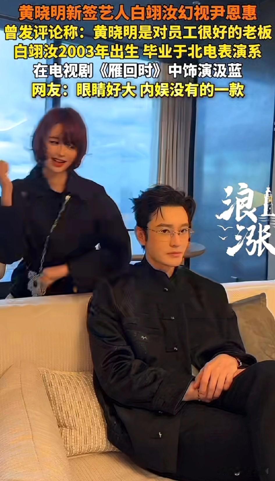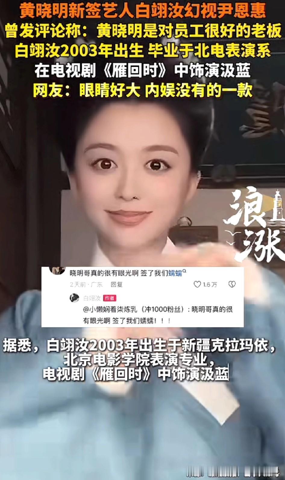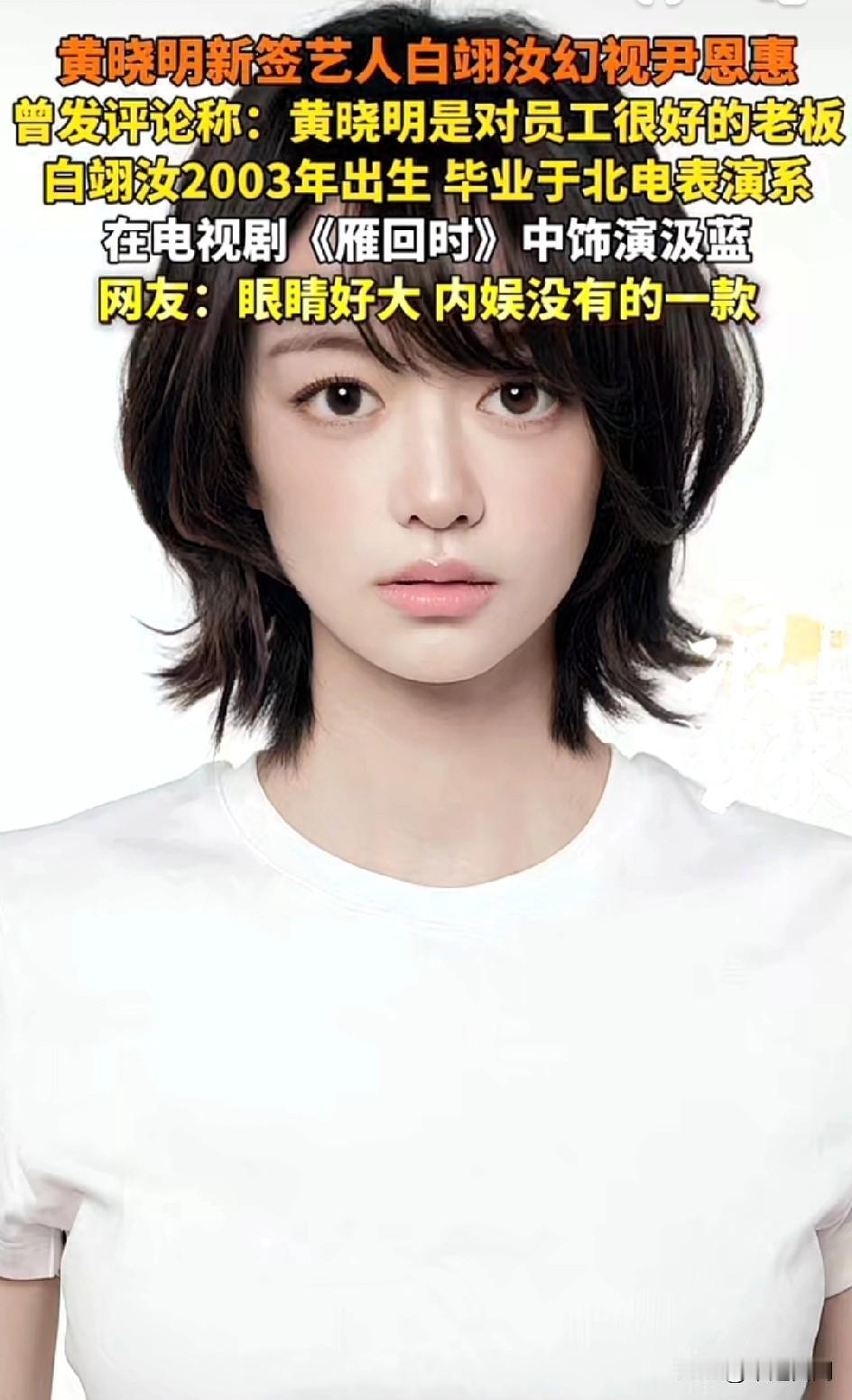 眼镜好大很美的桃花眼! 黄晓明新签艺人白翊汝幻视尹恩惠 曾发评论称:黄晓明是对员工很好的老板! 白翊汝2003年出生 毕业于北电表演系 在电视剧《雁回时》中饰演汲蓝 眼睛大大的萌萌的小美女 现在导演和老板也是有种选优,因为现在的女孩都很漂亮,千篇一律,观众有审美疲劳的,就像美国女演员,以前喜欢胸大女星,现在喜欢中性野性的女星,观众和导演的品味在逐渐改变,额好像越来越表态![捂脸]
