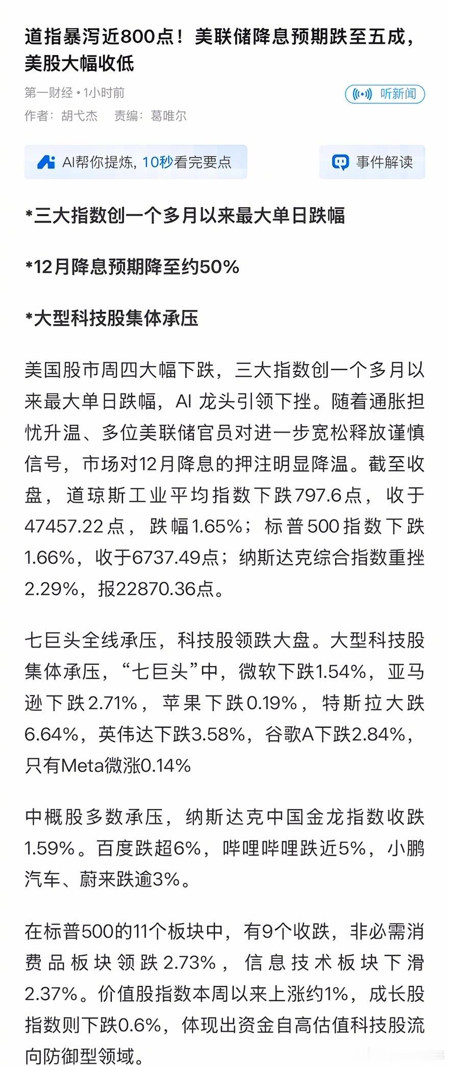 12月美联储降息25基点概率降低至47%,上周还是70%,道指暴跌近800点!