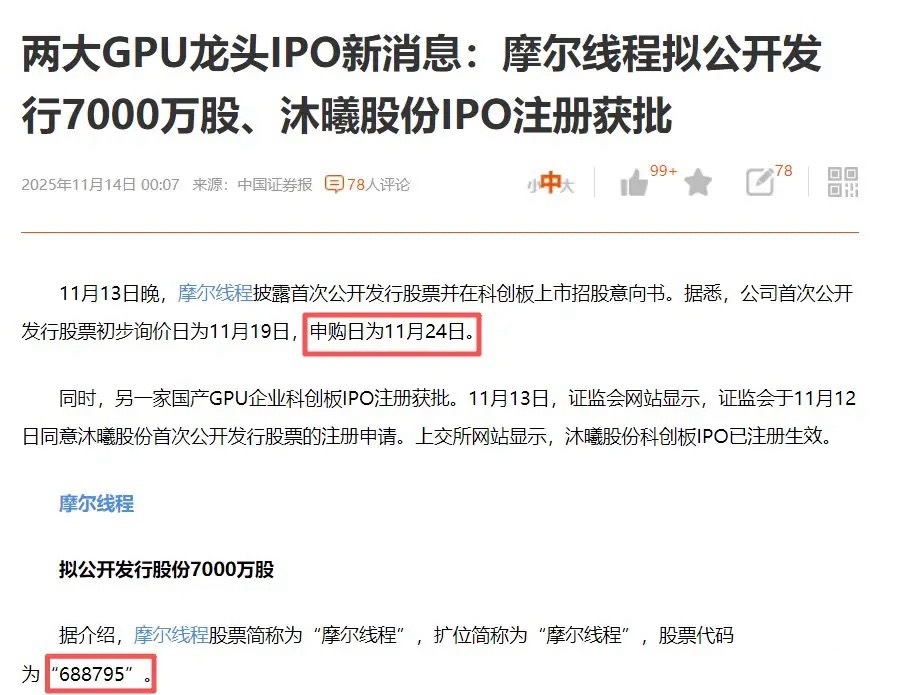 科技牛市的收尾速度在加快!摩尔线程11月24日科创板IPO,股票代码688795;另外一个GPU独角兽沐曦股份,IPO注册也已经获批!三千预计明年上半年,至少有一家机器人公司IPO,宇树科技?智元机器人?时间节点不确定,机器人公司肯定想等技术突破订单落地,这样IPO会更加轻松惬意,更加给得起估值,更符合VC的投资目标!机器人上市越晚,这场牛市结束的时间就越晚,这里面交织着矛盾的情绪。…