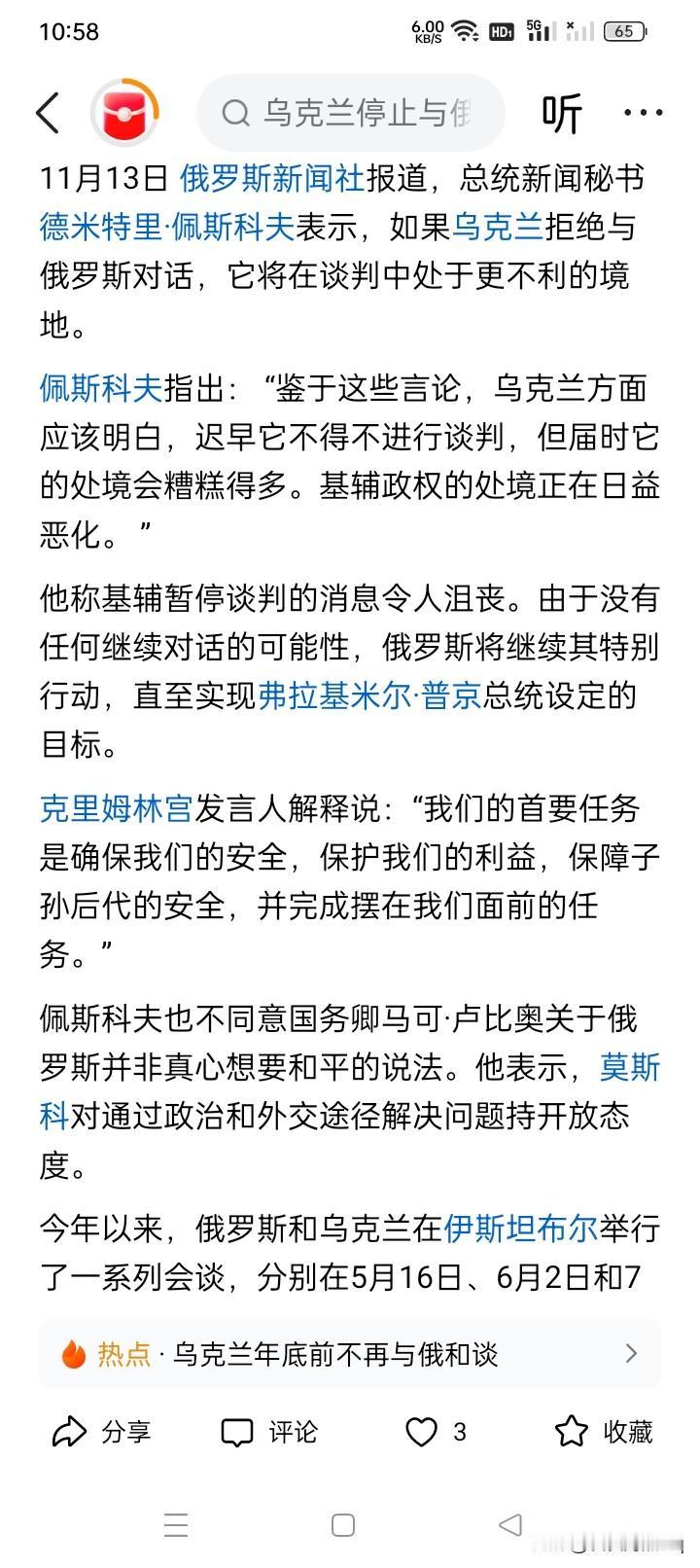 措词暗臧心机? 不谈判(不谈判好像就是不投降)也有祸? 俄罗斯总统新闻秘书佩斯科夫昨天对乌克兰宣布的不在今年与俄罗斯进行谈判的反应声称:虽然乌克兰现在表示不与俄罗斯进行谈判,但他们迟早还要坐在谈判桌上,不过,到那时乌克兰的情况会更糟。而且,如果乌克兰不与俄罗斯进行谈判,俄罗斯只有继续军事行动,只至得到普京总统设定的目标。 虽然威胁的意思似乎跃然纸上,但首先有个疑问,难道乌克兰到土耳其与俄罗斯方面进行谈判,俄罗斯就会停止军事行动,结束乌克兰战争吗?估计可能性不大。 最关键的是,网络上有很多报道这个消息时说,佩斯科夫似乎首次提到俄罗斯对乌克兰的特别军事行动,要得到的好像就是普京总统的目标。这似乎有点暗流涌动的味道。这是否是在试图摆脱责任,撇清关系?