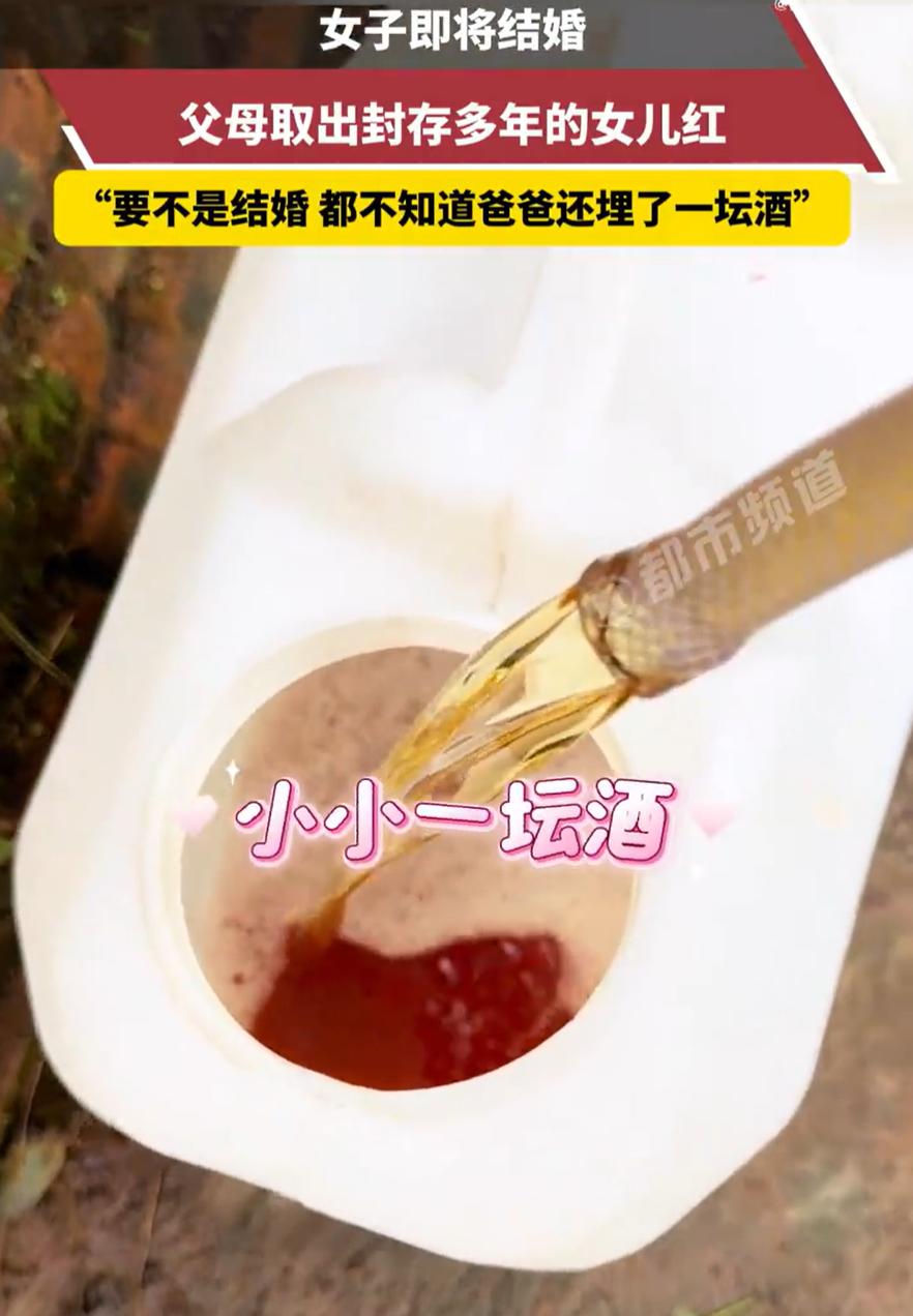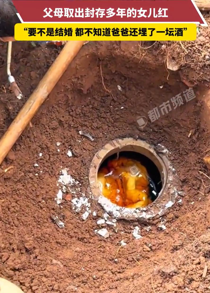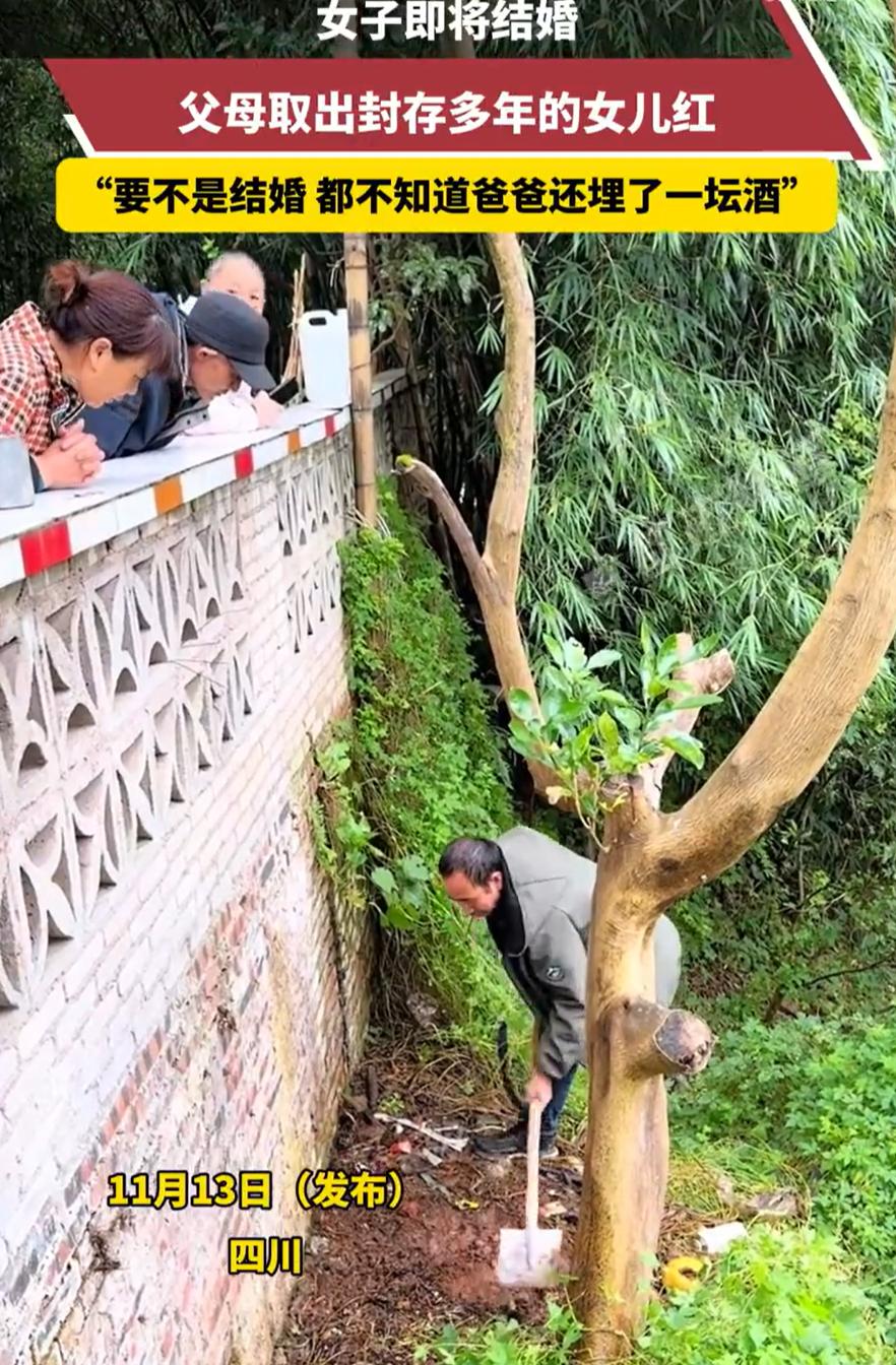 “父爱如山!”四川,一女子即将出嫁,父亲突然找到她,神神秘秘说要带着她出去一趟,还带上了刨土的工具,随后他在家门口的树下,亲手挖出封存多年的女儿红,女子感动:要不是结婚,都不知道爸爸还埋了一坛酒 一开始,女儿也是不明所以,还以为是去修树又像要挖地基,直到父亲蹲在家门口的大树下,一铲一铲把土拨开,那坛沉睡多年的女儿红才慢慢露了出来,她这才知道,原来父亲还有这么一个秘密 这坛酒足足有一百斤,封在树下好多年。父亲用蜡封口,还放了红枣、枸杞和冰糖。女儿出生那天,他可能随手记住了一个念头,以后有一天她要嫁人,我得准备点什么。然后这一埋,就是好多年 取酒的时候,他们用塑料管抽,管子一放进去,酒顺着流出来,颜色还是红的。家里人当晚就尝了一口,有味道但不冲鼻,没有想象中那种土味 女子说说,她之前完全不知道家门口那棵树下还有这样的心意,如今回头看,总觉得盯着那片土地这么多年的,可能不仅是树的根,还有父亲的心思 网上有人吐槽储存方式,甚至有网友说用塑料管取酒,白瞎了这好酒 我倒觉得,每个地方有每个地方的传统,每个家庭有每个家庭的记忆。重要的不是储存方式是否完美,而是这份心意历经岁月依然温热 生活中,很多父母都会用自己独特的方式表达爱。可能是一坛酒,可能是一本相册,也可能是每周电话里不变的叮嘱。这些爱平常到容易被忽略,却总在某个时刻让人恍然大悟,这才是真正重要的