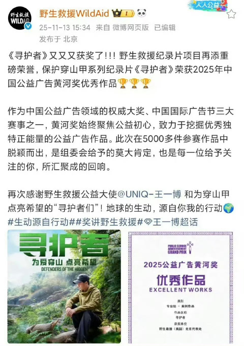 难怪都传博帝要去金鸡,我说怎么传假消息。原来真去了,是刚得了中国2025公益广告黄河奖的《寻护者》去了!保护穿山甲系列纪录片《寻护者》将会在金鸡进行展映,666,做啥都是行业楷模
