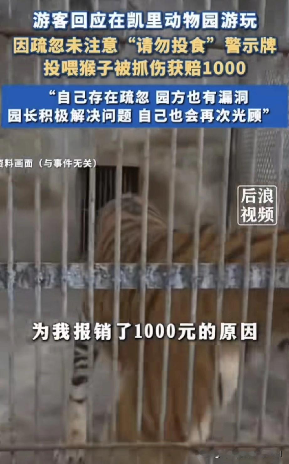 游客发布视频回应在凯里动物园游玩时投喂猴子被抓伤一事。他因疏忽没注意到“请勿投食