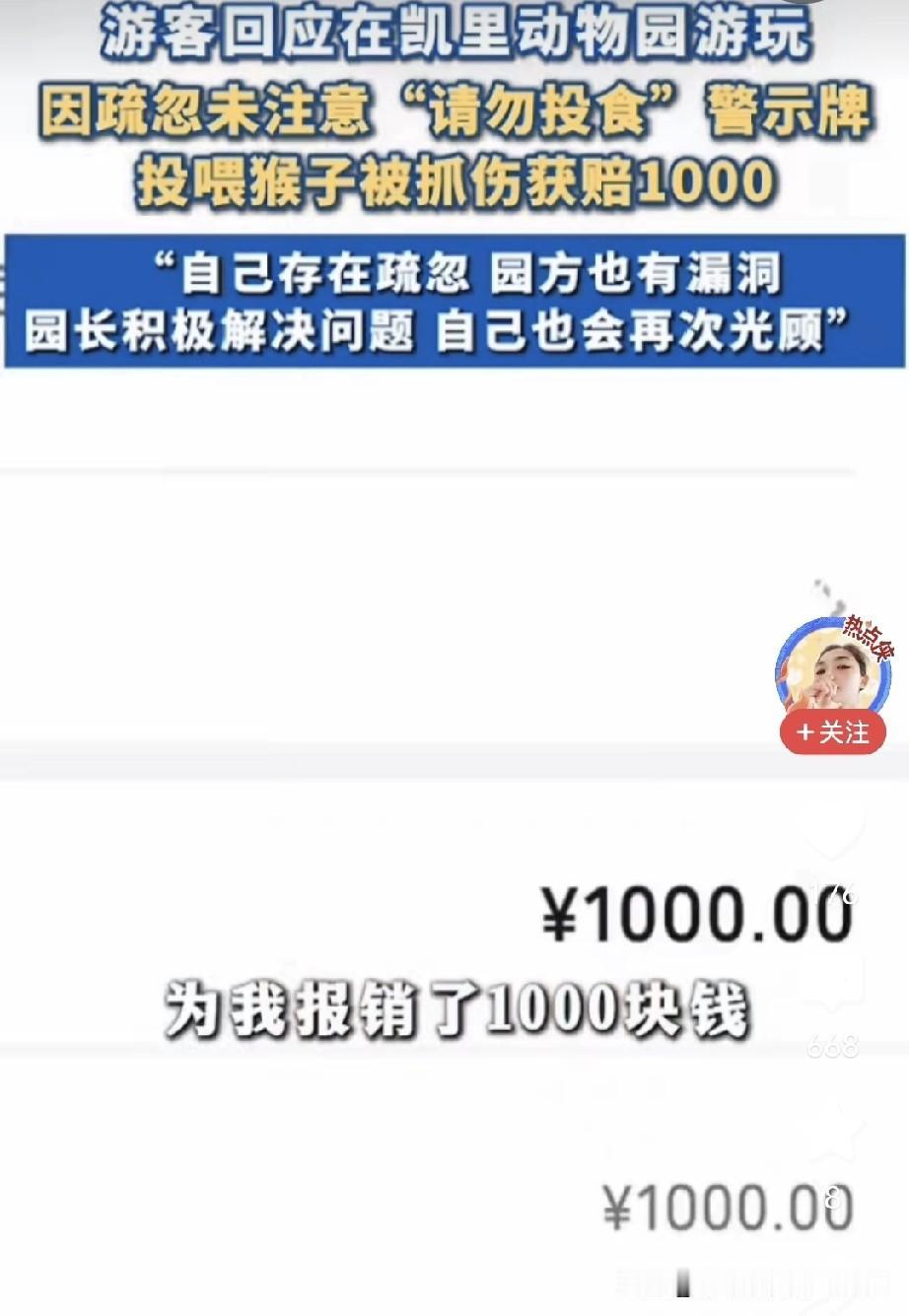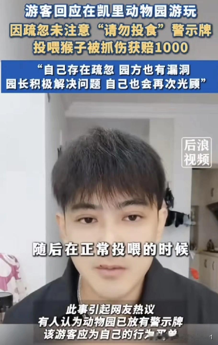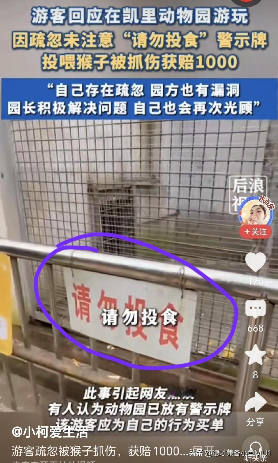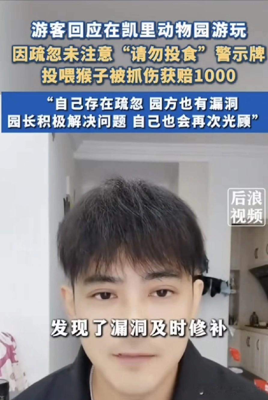游客发布视频回应在凯里动物园游玩时投喂猴子被抓伤一事。他因疏忽没注意到“请勿投食”的警示牌,投喂猴子时被抓伤,去医院打针花了1447元,后来找动物园报销了1000元,此事引发网友争论。 一方觉得这是男子个人行为,他应负全责;另一方则认为男子是在碰瓷、讹钱。 男子还在网上查了相应的动物园管理规范, 一是查看有无提示警示牌, 二是看动物园的防护设施是否坚固,能否防止猴子把手伸到笼子外面。这只猴子本就不让投喂,在此情况下,笼子不应留有缝隙让猴子伸手出来。事发后,动物园第二天就采取了补救措施,在笼子上加固了铁丝网。 三是游客投喂猴子时,是否有工作人员加以阻止。男子称当时旁边没人,显然无人阻止。基于这三点,因动物园只占其中一点,另外两点不占,所以男子要求动物园报销1000元打针费,他打针共花费1474元。 有人质疑:那么大的“请勿投食”四个字,他没看见吗? 他是成年人,要对自己的行为负责。即便动物园有责任,但他是主动投喂,并非被动受伤,按责任分摊制,他应负70%的主要责任。在动物园隔着围栏不投喂是所有中国人的共识,除非是不认识汉字的外国人,那还情有可原。自己犯错还说得冠冕堂皇,若不改这毛病,以后有吃不完的亏。 总结来说,男子的逻辑就是:我有错,但我不认,我犯错时你怎么不制止我,真是逻辑鬼才。 对此大家怎么看?