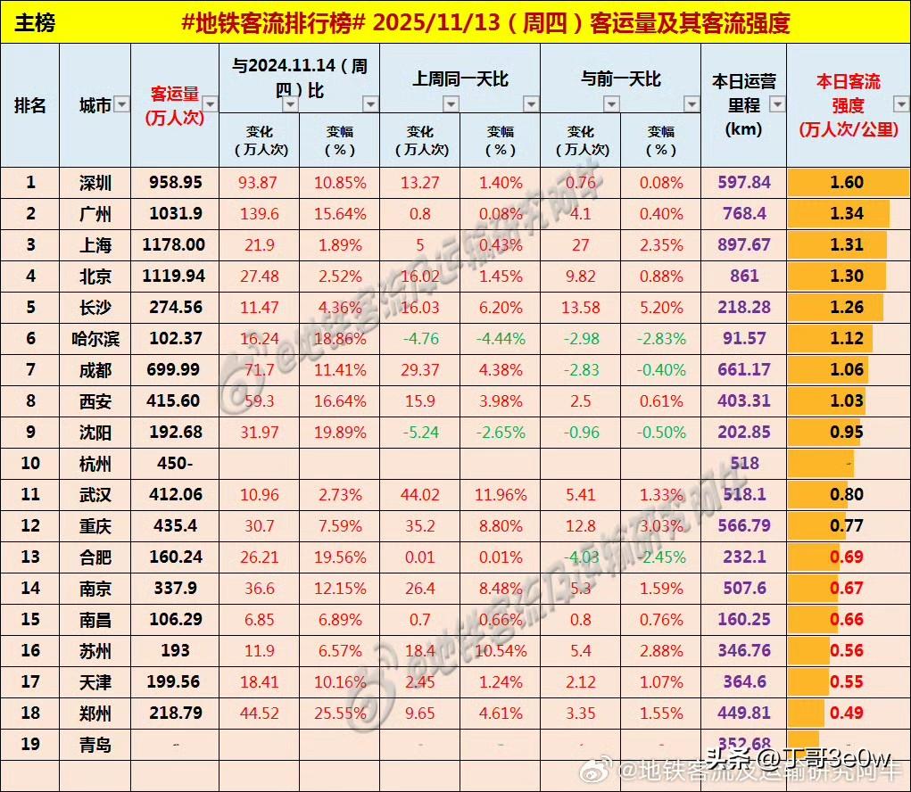 成都、天津地铁客流量昨日均擦边未超过整数大关,非常遗憾[呲牙][呲牙][呲牙] 爆料 身边事 排行榜 周四 地铁客流排行榜 中国地铁客流日报 昨日客流 2025年11月13日 星期④ 全国重点城市轨道交通客流量排行榜: 上海:1178.00万 北京:1119.94万 广州:1031.90万广州地铁 深圳:958.95万深圳地铁 成都:699.99万 杭州:450万+杭州身边事 重庆:435.40万重庆身边事 西安:415.60万西安爆料 武汉:412.06万武汉地铁 南京:337.90万南京地铁 长沙:274.56万 郑州:218.79万郑州爆料 天津:199.56万天津身边事 苏州:193.00万苏州爆料 沈阳:192.68万沈阳身边事 合肥:160.24万 青岛:100万+ 南昌:106.29万江西南昌身边事 哈尔滨102.37万