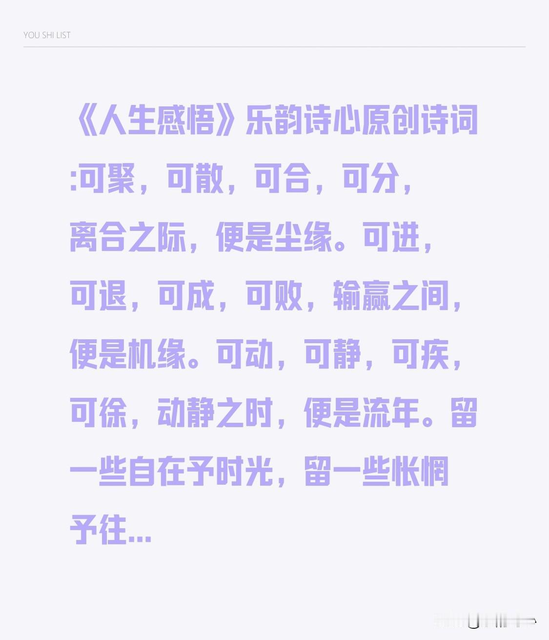 《感悟人生》乐韵诗心原创诗词: 可聚,可散,可合,可分,离合之际,便是尘缘。 可进,可退,可成,可败,输赢之间,便是机缘。 可动,可静,可疾,可徐,动静之时,便是流年。 留一些自在予时光,留一些怅惘予往昔,留一些豪情予明天。 随性些,洒脱些,开怀些,到哪天,就尽情度哪一天。 抱微缺之意,赴圆融之境,生命有瑕疵,方为自然。