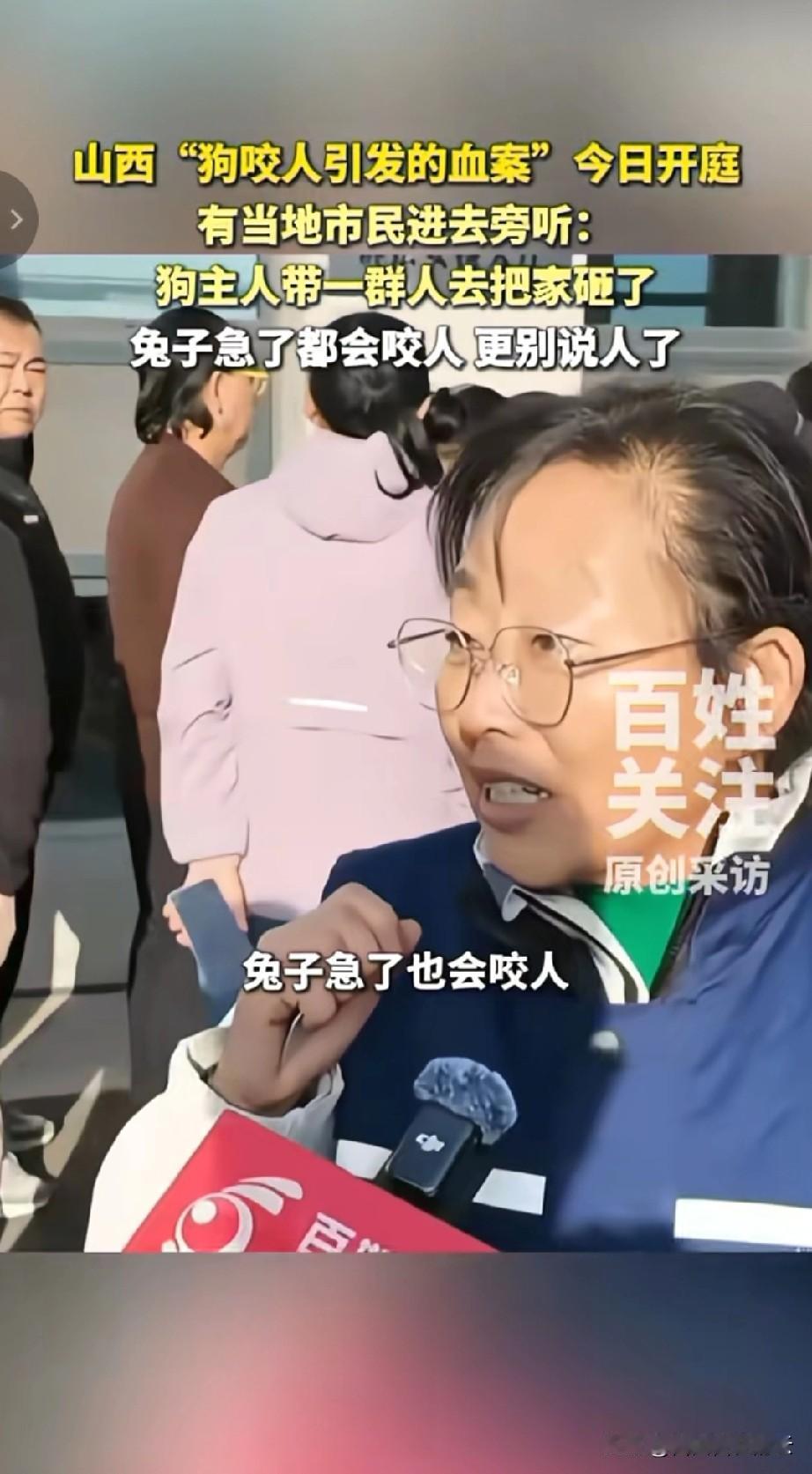 狗咬人狗主人被反杀这个案子昨天在长治法院开庭,庭审结束后,有旁听的市民说,这本来就是个小事,你可以去人家家里坐下来谈这个事,这都好说。可是你带这么多人去人家家里,还把人家里给砸了。兔子急了还咬人呢! 我觉得这个大姐的想法代表了大多数人,于情于理,是狗先咬人了,而且狗主人有过错,狗没有拴绳。 如果他没有打死你家狗,按说你就得赔偿人家损失。他打死了你家狗,也是发生在狗咬人之后,你觉得他有责任,可以找帽子叔叔解决,看看谁的责任大。实在不行还可以走法律。 可是明明申某某的儿子都去派出所等着了,派出所也给你们打电话了。你们非要自己解决,带着一群人冲到人家家里,又打又骂。这时候已经威胁到申某某和家人的人身安全了,他只能做都是为了保护自己和家人。 在我们老百姓的朴素观念里,没经过别人同意,硬闯进别人家里,就是“强盗”行为。所以我也同意大姐的说法,你把人逼急了,兔子急了还咬人呢!