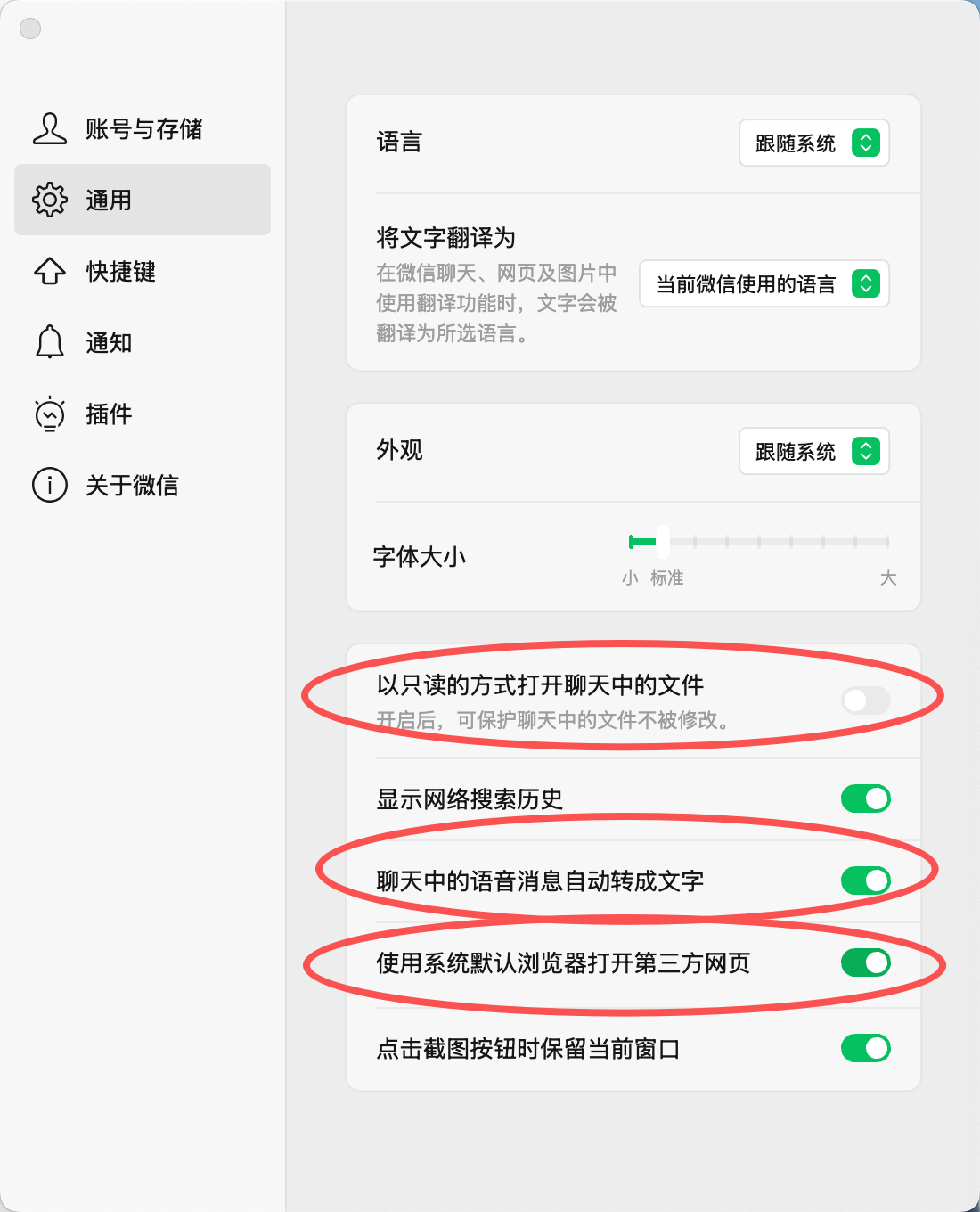 更新微信(电脑端)后的一些必要步骤:1、关掉自动下载;2、关掉「只读文件」(看个人喜好吧,不然你永远只能另存为);3、打开语音自动转文字;4、打开默认使用浏览器打开三方网页。