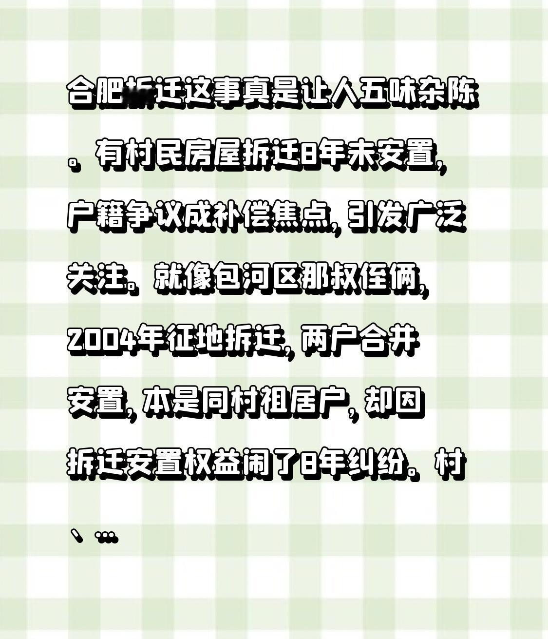 合肥拆迁这事真是让人五味杂陈。有村民房屋拆迁8年未安置,户籍争议成补偿焦点,引发广泛关注。就像包河区那叔侄俩,2004年征地拆迁,两户合并安置,本是同村祖居户,却因拆迁安置权益闹了8年纠纷。村、镇调解组织多次调解都没用,最后还是法院法官李玥玥化解了矛盾。 还有胡小郢村,8年前就有拆迁消息,如今才落实,608户居民终于能拿到高额补偿费。拆迁本是为了城市发展和居民改善生活,但过程中这些纠纷和延迟,真让人心累,希望以后能更顺利些。