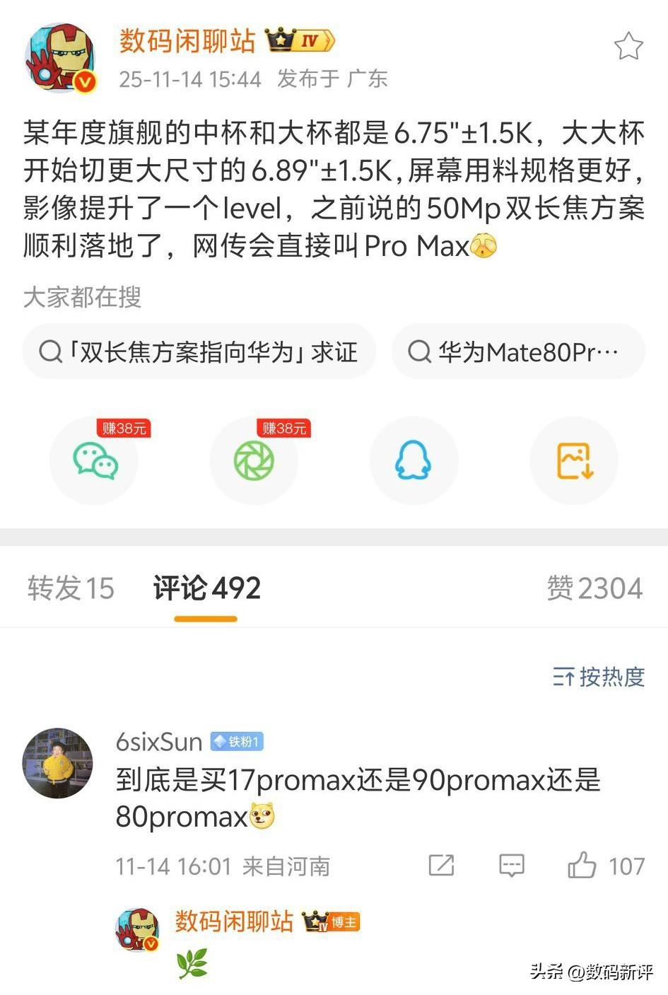 mate80系列配置再爆料[灵光一闪]标准版和Pro都是6.75英寸机身,而80Promax机型是6.89英寸大屏!影像再进一步提升,五千万像素双长焦方案设计,这次全系都有3D人脸情况下,标准版长焦再略微加强一下[奸笑]那么标准版销量对比mate70应该是可以大涨的