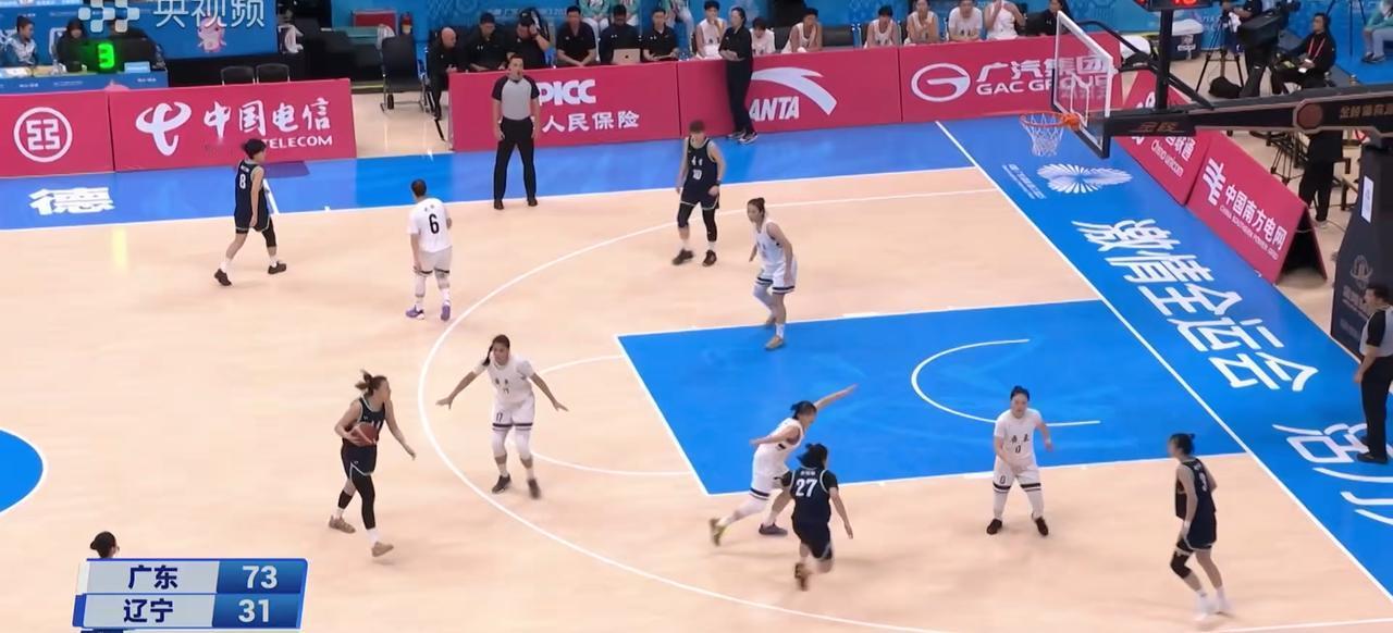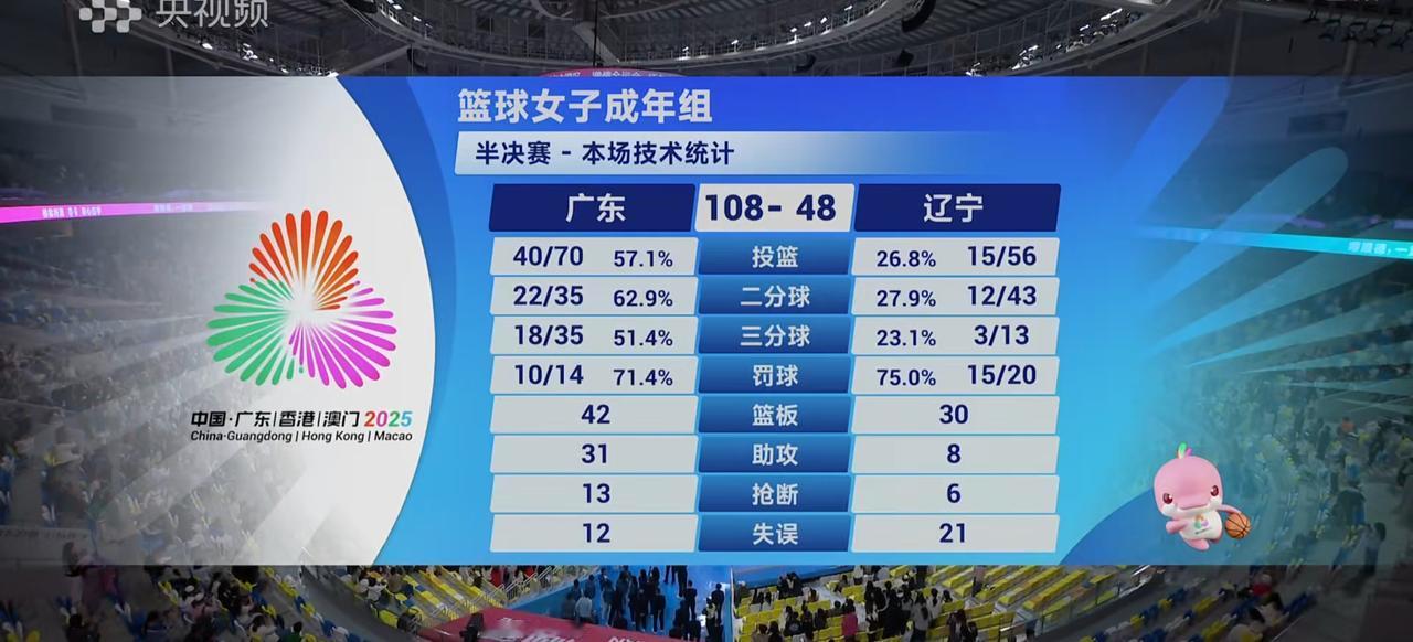 全运会女子篮球这场半决赛太炸裂了!广东队以108比48的大比分战胜辽宁队,强势打入决赛。广东队众女将投进了18个3分球,而辽宁队只有3个。投篮命中率57%,而对手只有15%。篮板球多了12个。 此前在八强淘汰赛,广东队就展现出强大实力,以102 - 73击败上海队,小组赛更是全胜出线,杨舒予和陈明伶内外配合超默契。反观辽宁队,虽八强赛62 - 60险胜北京队,但这场被广东队打得毫无还手之力。这场比赛广东队火力全开,进攻防守都相当出色,期待她们在决赛继续精彩表现! 篮球全运会