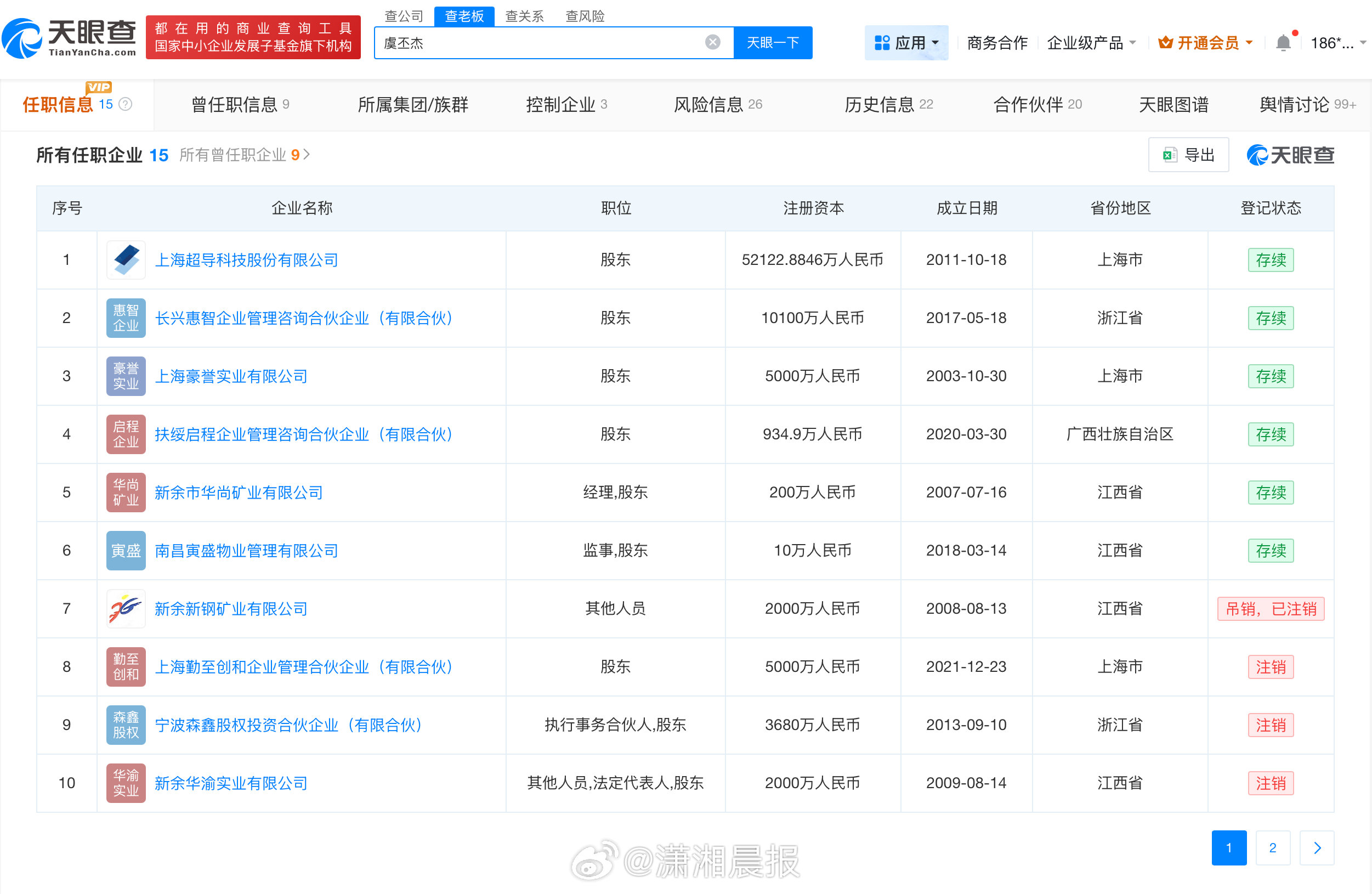 【】11月14日,搜索财经博主“老潘财商”主页发现,其曾有关虞书欣父亲虞丕杰商业剖析的“家里有矿系列”已不可见。据悉,今年8月,泰和泰(上海)律师事务所发文称:接受虞丕杰先生委托,就“老潘财商”频繁发布的涉委托人言论,依法维护委托人合法权益,针对“老潘财商”的相关行为采取包括但不限于提起诉讼等方式。 记者查询天眼查发现,虞丕杰名下关联15家企业,其中6家处于存续状态,分别是上海超导科技股份有限公司、长兴惠智企业管理咨询合伙企业(有限合伙)等,其余企业已注销或被吊销,分别是新余新钢矿业有限公司、上海勤至创和企业管理合伙企业(有限合伙)等。