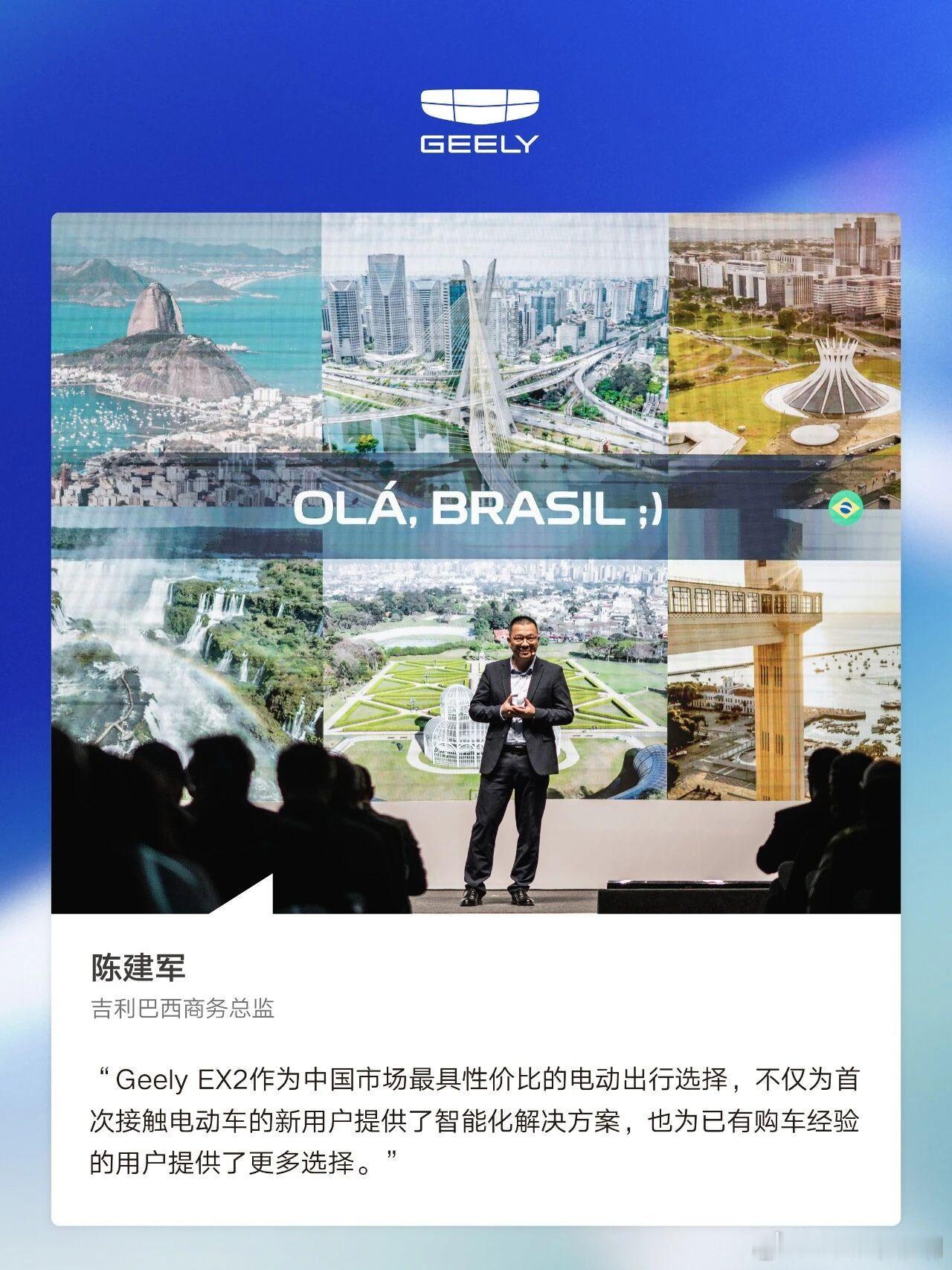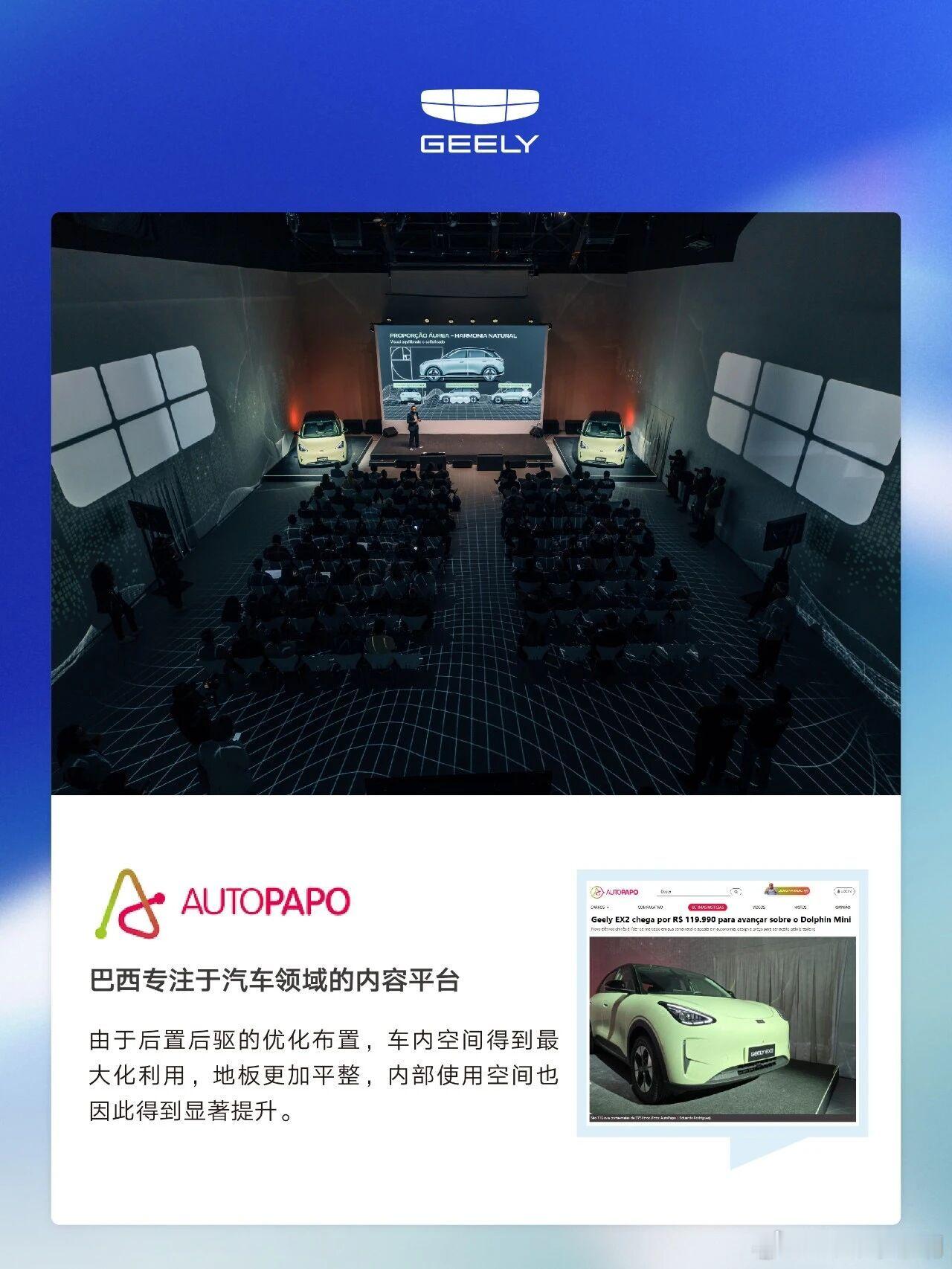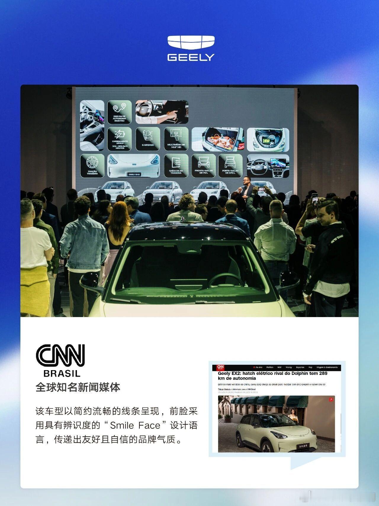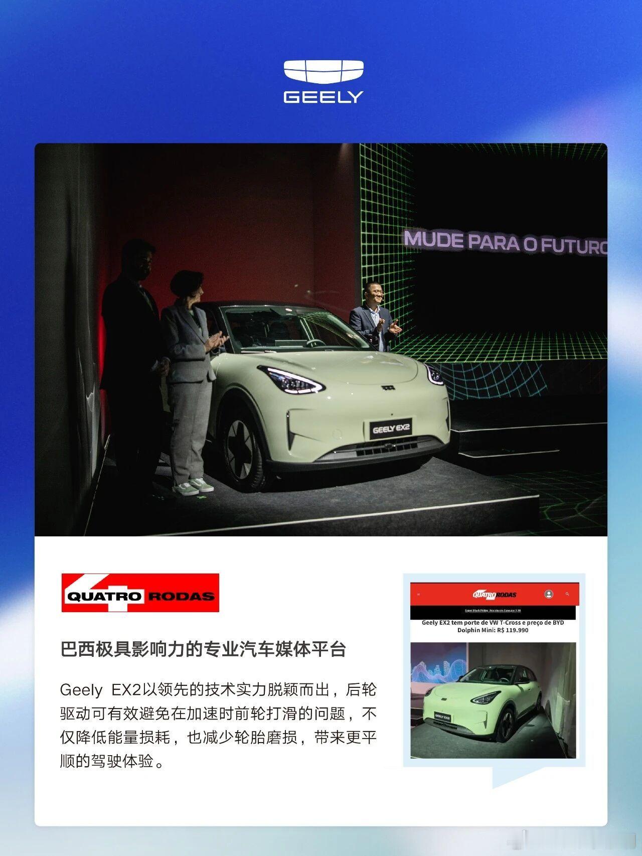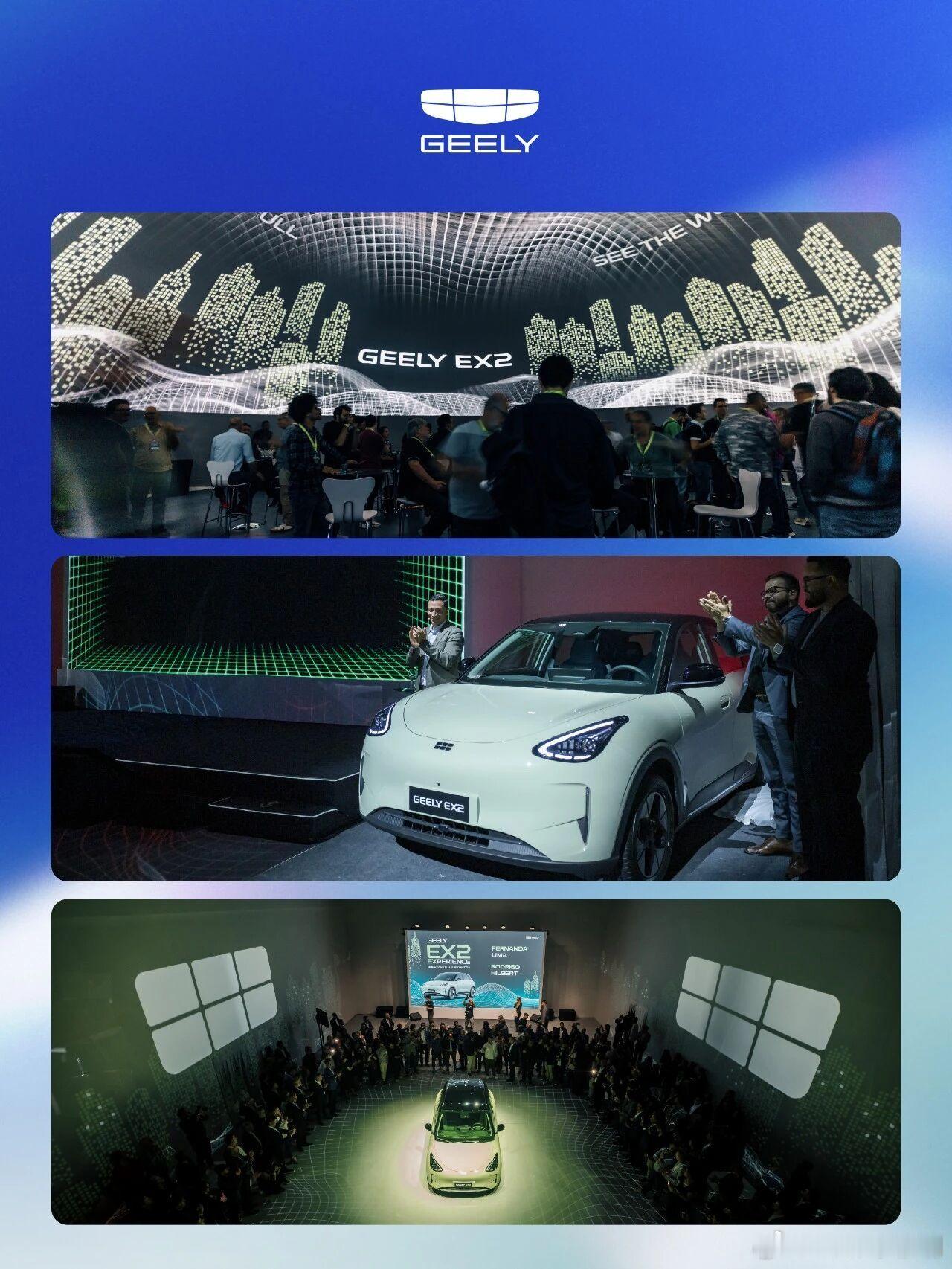 【🚗Geely EX2闪耀巴西,绿色风暴席卷南美!】🌟科技与城市美学碰撞!Geely EX2在圣保罗以“城市天际线”为主题惊艳首秀,360°沉浸式体验引爆现场🔋新车实力认证:巴西能效测评本土市场TOP1!继Geely EX5稳坐细分市场销冠后,EX2再拓产品矩阵