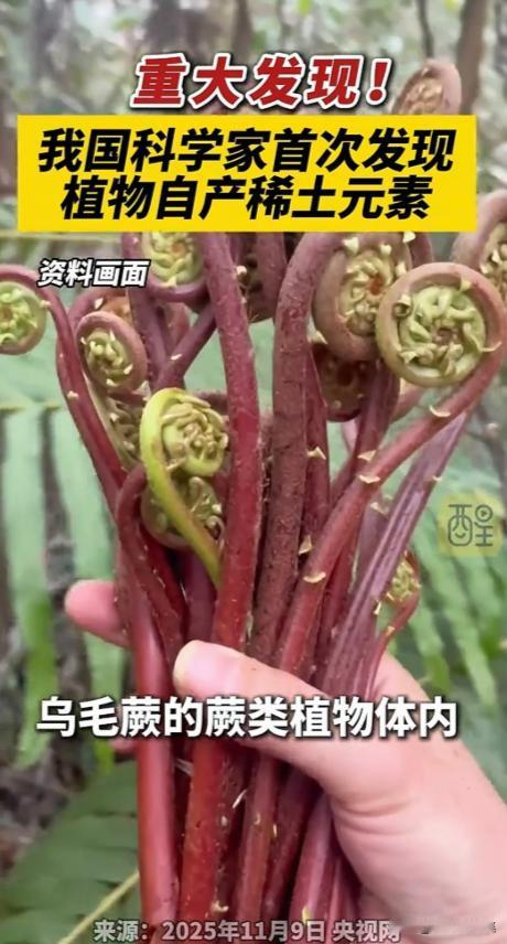 国运来了挡都挡不住!平时随处可见的乌毛蕨,被我国科研人员一研究,直接炸出世界级大发现 —— 这玩意儿不仅能 “吸” 稀土,还能让稀土在自己体内 “搭积木”,自动组装成 “镧独居石” 矿物!谁能想到路边不起眼的野草,竟藏着 “稀土金矿”,这不是国运来了是什么? 11 月刚出的消息,科研团队去南方山区摸底,本来是想弄明白有些植物为啥能在稀土扎堆的土里活下来 —— 毕竟对多数植物来说,过量稀土跟毒药没差。 没成想,注意力全被乌毛蕨这随处可见的家伙勾走了,一检测才发现,这野草体内稀土攒得特别多,比一般植物高出几百倍,简直是把土壤里的稀土往自己身上 “扒拉”。 更绝的是稀土在它体内的状态。这些被吸进来的稀土元素没乱堆,反倒在叶片的输送管道和表层组织里自己归置整齐了:先变成纳米级的小颗粒沉下来,慢慢聚成结晶体,最后干脆形成了 “镧独居石” 这种矿物。 要知道,这矿物以前都是靠岩浆喷发、热液活动那种高温高压的地质运动才能形成,没人敢想一株野草在常温常压下就能干成这事。 后来才琢磨明白,这是乌毛蕨的生存招儿。稀土离子对它的细胞同样有毒性,它就干脆把这些 “麻烦东西” 打包封进矿物结构里,稳稳锁住,相当于给自己 “解毒”。 既保住了自己的命,还顺便把稀土元素存得整整齐齐,这操作真是把生存智慧玩到了极致。 而且这植物 “造” 出来的独居石,比天然矿石靠谱多了。天然的独居石里总混着铀、钍这些带辐射的元素,开采提纯又麻烦又危险。 但乌毛蕨体内的 “生物独居石” 干干净净,一点辐射没有,要是用来提稀土,绿色环保的优势一下就凸显出来了。 稀土这东西的分量不用多讲,“工业维生素” 的名头摆着,人工智能、新能源汽车、高端装备都离不了,是实打实的战略资源。可传统开采要么挖山毁林,要么用化学药剂浸出,污染一大片,后续治理成本高得吓人。 现在乌毛蕨这发现一出来,等于给稀土利用开了条新路。以后在稀土尾矿或者污染的土地上种乌毛蕨,它一边吸走土里的稀土,一边把土地修正好,长够六八个月收割了,烧出灰分就能提稀土氧化物。 初步试验算过,一公顷地一年能收两三公斤,虽说比传统采矿产量低,但生态和经济两头都顾上了,把以前的 “环境包袱” 变成了能换钱的资源。 以前学界只清楚微生物、动物能在体内造矿,比如贝壳里的方解石、骨头里的磷灰石,植物这本事一直没被看重。 这次在乌毛蕨身上的发现,不光刷新了对植物的认知,还给近千种已知的 “超积累植物” 研究打开了口子,说不定以后还能找到更多有这本事的植物。 这成果已经发在了国际权威期刊上,全球同行都能看到。现在虽然还没到大规模 industrial 应用的阶段,提取时要处理钙、铝这些杂质,还有些技术坎要过,但国家已经把项目列入专项,准备在江西、广东搞几块试验田试试水。 想想也挺有意思,以前路过山边见着乌毛蕨,谁会多瞅一眼?顶多觉得是株普通蕨类,说不定还嫌它挡路。现在倒好,摇身一变成了藏着 “稀土金矿” 的宝贝疙瘩,这反差简直没谁了。 这背后固然是科研人员蹲在山里一点点采样、化验的功劳,但这种 “无心插柳” 的突破,往往也透着股挡不住的国运势头。 要是不支持这类看起来 “细碎” 的基础研究,要是科研人员没沉下心琢磨 “植物为啥能在稀土土里活”,就算乌毛蕨长在眼前,也发现不了它的秘密。 现在这突破不光给稀土产业找了条绿色出路,更说明咱们的科研早就扎进了田间地头、山间野草里。 以后再看见乌毛蕨,估计没人会再把它当普通野草。这不起眼的植物背后,藏着的是中国在战略资源领域的新底气。 这种从身边小事物里挖出世界级大发现的事儿,不是国运来了是什么?不用硬拼资源,沉下心搞研究,连野草都能给你带惊喜,这股势头确实挡不住。 参考资料:财联社《关于稀土,中国有重要发现》