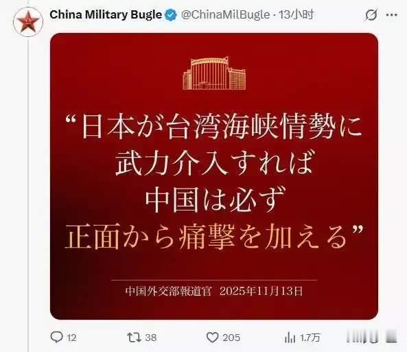 针对近期高士早苗的狂妄言论,2025年11月13日,中国军号在社交平台X发布日语