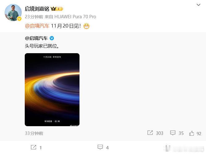 刚刚 发布“头号玩家已就位”,并配图预告将在11月20日发布。同时启境汽车CEO 也发博表示11月20日见!启境是广汽+华为联合打造的全新汽车品牌,开启新品牌+新合作模式!我们也期待11月20日下周与新品牌见面!