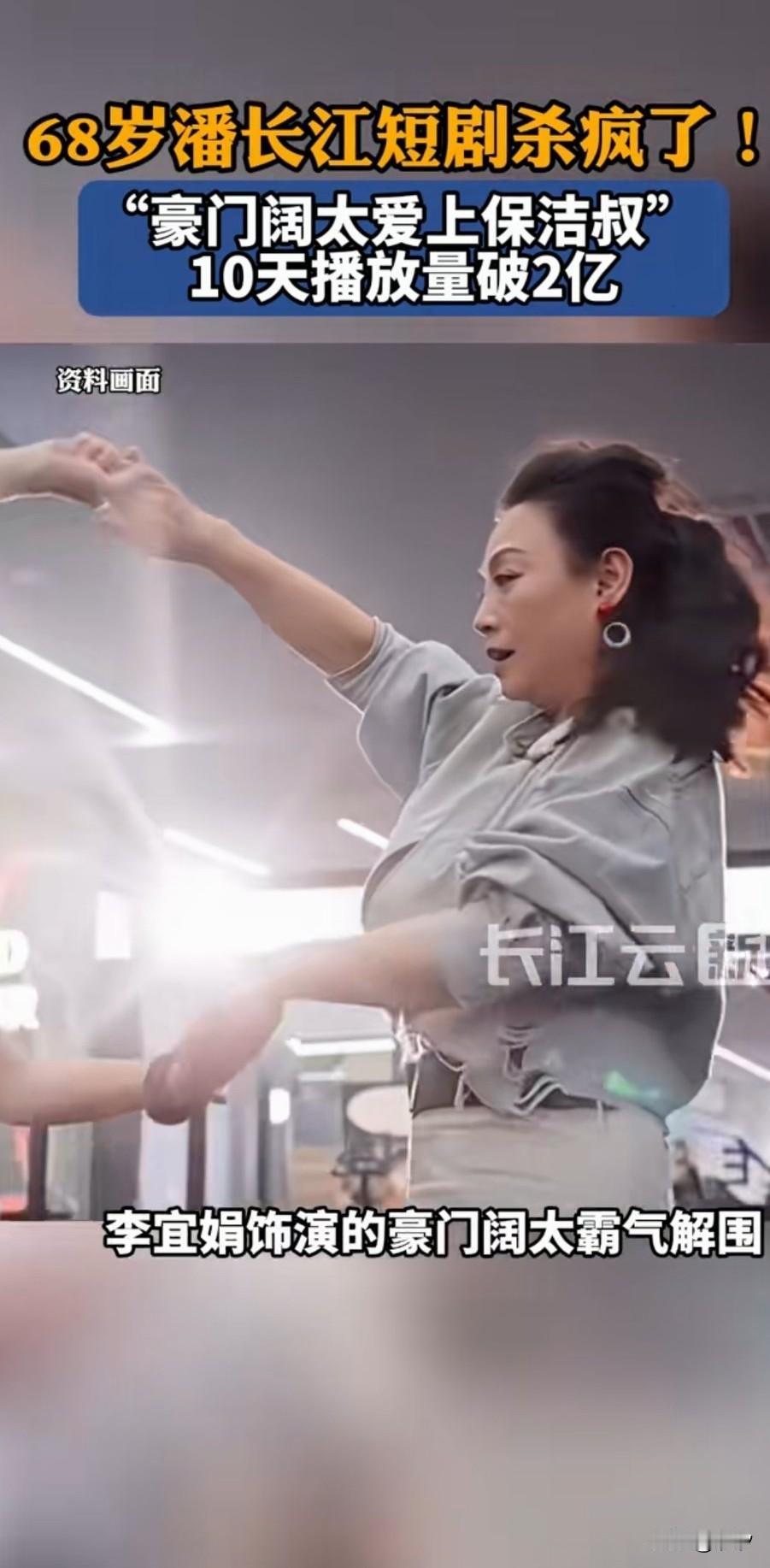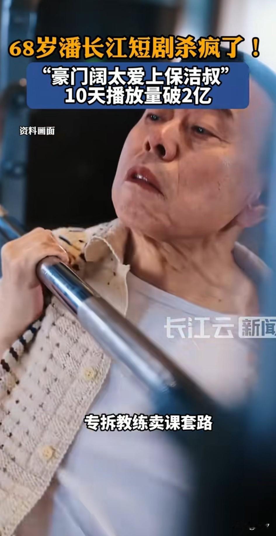 68岁潘长江短剧杀疯了, 最终二扮演了一位保洁大叔, 还在健身房卖课, 意外被富婆看中, 上演了豪门富婆爱上保洁大叔的戏码, 智斗村霸,土味情话, 胖粉丝直呼受不了, 女主出演过甄嬛传的李宜娟, 也是年龄比较大的演员, 这个短剧《进击的潘叔》, 10天播放量突破2亿, 目前还在狂飙, 看来很多中老年人还是喜欢潘长江的! 他的号召力还在! 目前中国短剧市场火爆, 不少专业演员纷纷进入短剧行业, 不少老戏骨也凭借短剧再次翻红, 质量和画面也越来越精致, 相信不久的将来短剧必然霸屏! 大家对于潘长江这部短剧怎么看? 潘长江 郭达潘长江蔡明 富婆系短剧 潘大叔对口型 富婆装嫩
