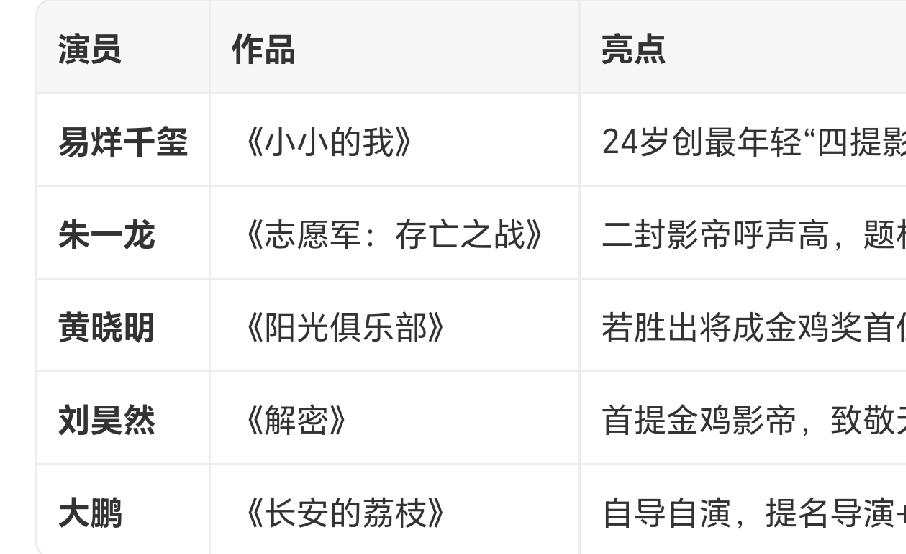 今年的金鸡奖最大看点是最佳男主角,两次金鸡奖获得者黄晓明,一次金鸡奖获得者朱一龙,首提的刘昊然和四提的易烊千玺,以及提名男主又提名导演的大鹏,到底花落谁家? 先用排除法,首先排除刘昊然,题材弱于朱一龙,人气不如易烊千玺。 其次排除大鹏,最佳男主都没有最佳导演有说服力[捂脸]! 再其次排除黄晓明,这么多年轻的提名了,他该退一退了! 最后就剩下朱一龙和易烊千玺了,提名表彰朱一龙未到场,这就很明显了吧! 易烊千玺很有希望,溜了四次了,也该轮到他了!金鸡奖 金鸡奖颁奖红毯
