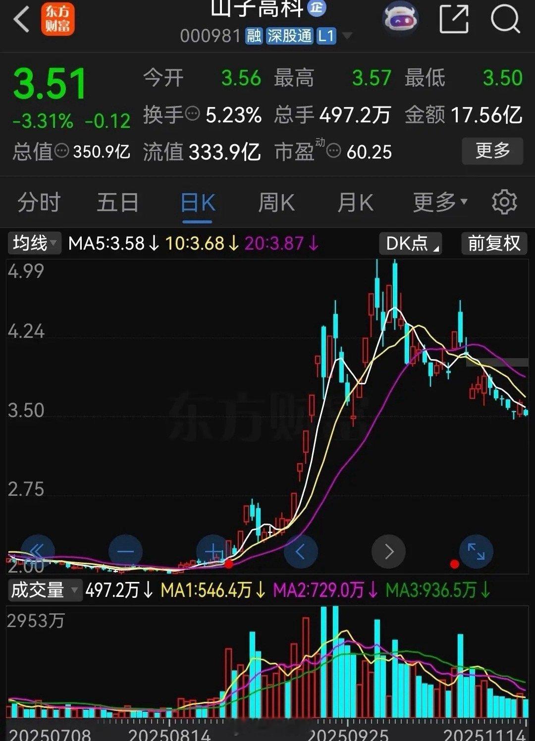 两天成交152亿,把散户骗到了山顶!10月29日山子高科股价强势涨停封板,当天成交了56亿元,10月30日高开四个多点,股价再次拉升,盘中最高涨到了4.60元,涨幅近7%,不少股民以为要连板,纷纷冲了进去,结果股价突然崩塌,一路下跌,当天收出一根大阴线,成交额96亿元。这两天成交了152亿。然而公司周末突然暴雷,因财务数据不准确,收到证监会警示函,股价开始一路下跌,如今已经跌了半个月,今天收盘股价报收于3.51元,已经较10月30日的高点下跌了24%,这段时间抄底的股民也全部被“活埋”!公司的股价从去年的0.77元涨到今年的最高4.99元,上涨了近7倍,涨那么高了,还有人去博傻,这亏得一点也不冤,这样的走势堪称教科书式的收割!