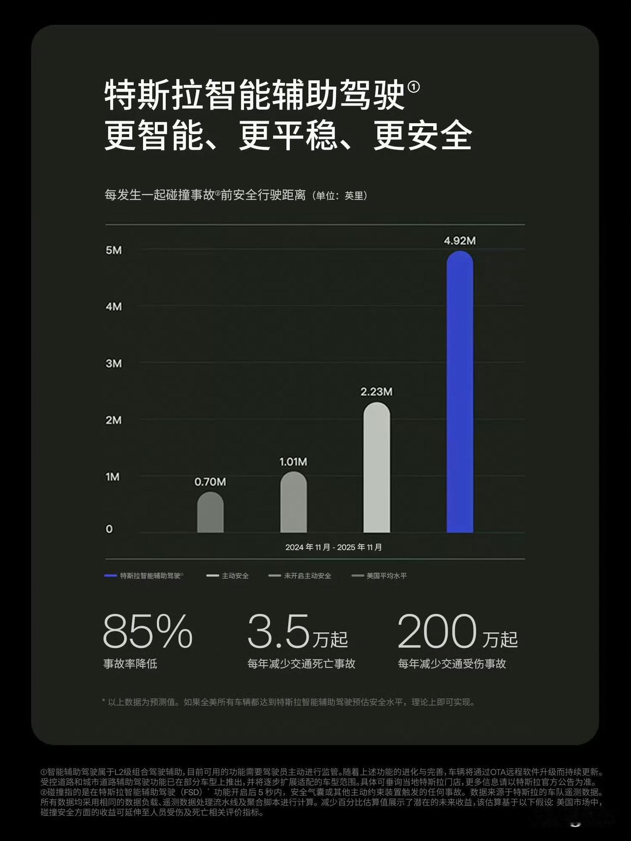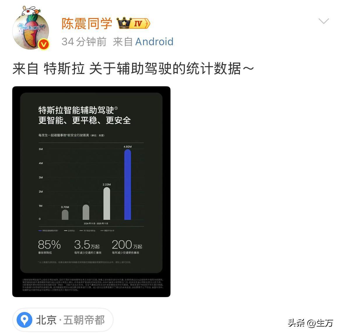 陈震: 这是特斯拉关于辅助驾驶的统计数据! 今天晚上,陈震找到了一个统计表格,上面是每一年特斯拉,有关于辅助驾驶方面的数据统计。 统计时间是去年的十一月份,到今年的十一月份,从这个统计数据上来看,开了特斯拉的福利驾驶降低了85%的事故率。 还有一些常规的数据,只不过这些数据应该都是基于美国那边的,毕竟我们这边的特斯拉驾驶系统基本上是不能怎么用的。 当然,下面也有整整好几行小字,对辅助驾驶方面的规定进行了补充和说明,对小字敏感的朋友们可以看看,他这些字看起来怎么样[捂脸]