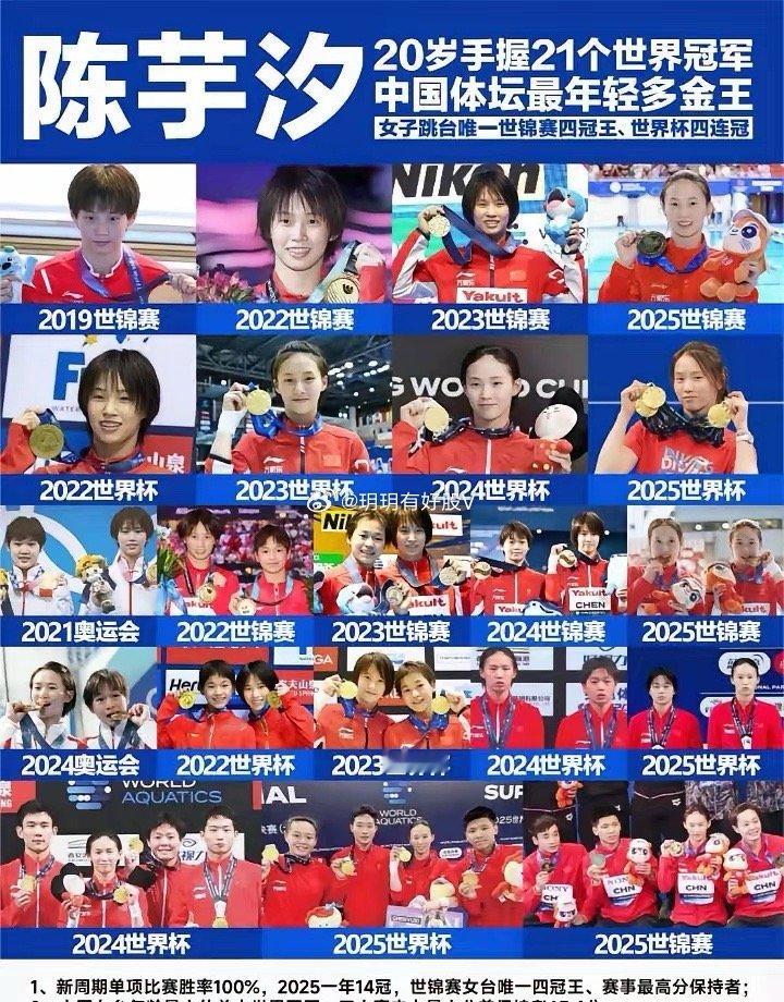陈芋汐一共21个世界冠军,2025年就拿了6个。2025年真是陈芋汐全面开花的一年,谁敢点进她的微博,全是微博自动推送的获奖微博,一共14个冠军,胜率100%。感谢现役,感谢20岁的陈芋汐还在坚持,陈芋汐每多拿一个单人冠军,中国跳水女台的历史就向前多走一步