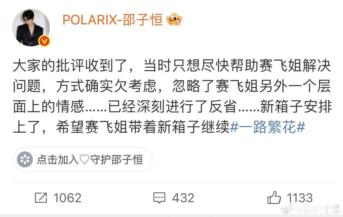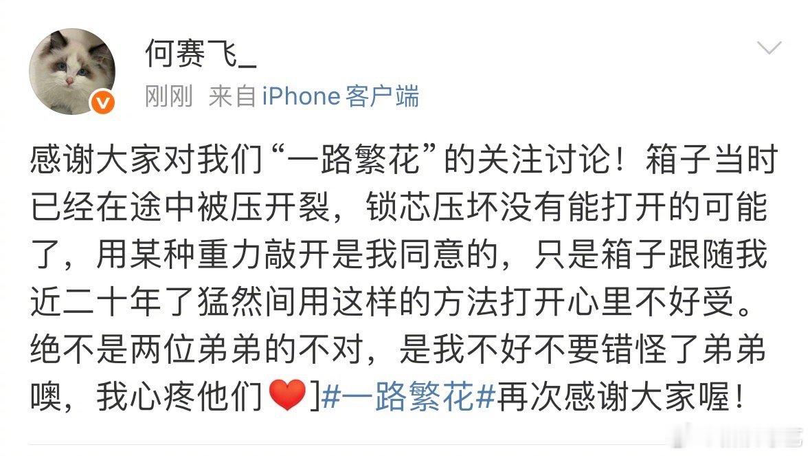 今日 播出, 帮姐姐 踹开行李箱的内容引发大家讨论,其中存在一些不友好的评价,两个弟弟相继发文道歉,而何赛飞在看到弟弟发文后,火速出来护短,表示“绝不是两位弟弟的不对,是我不好不要错怪了弟弟噢,我心疼他们”,真的有被繁花团相互守护的感情戳到~