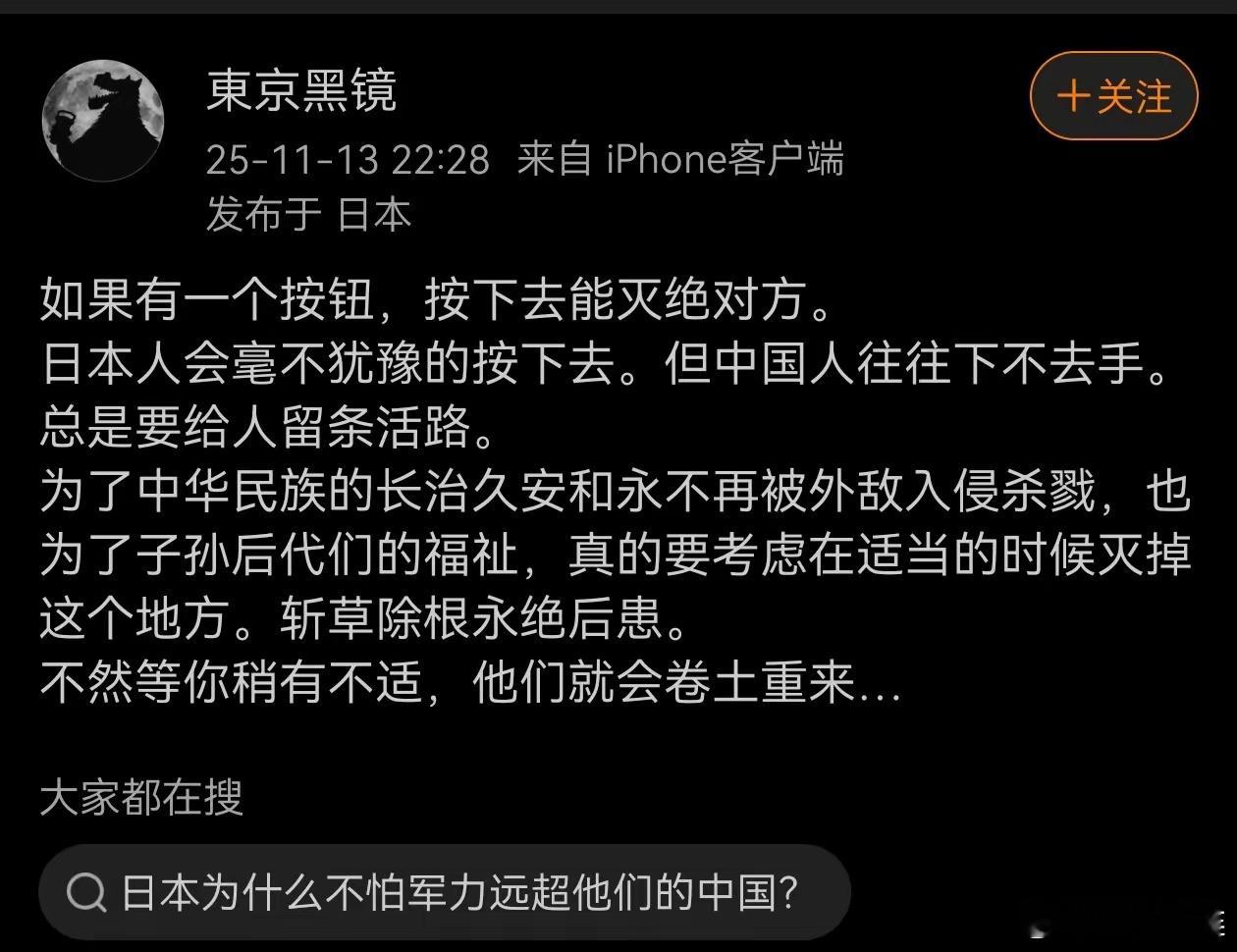 网友说,如果有一个按钮,按下去能灭绝对方,日本人会毫不犹豫的按下去,但中国人往往下不去手。深以为然!中国太善良了!