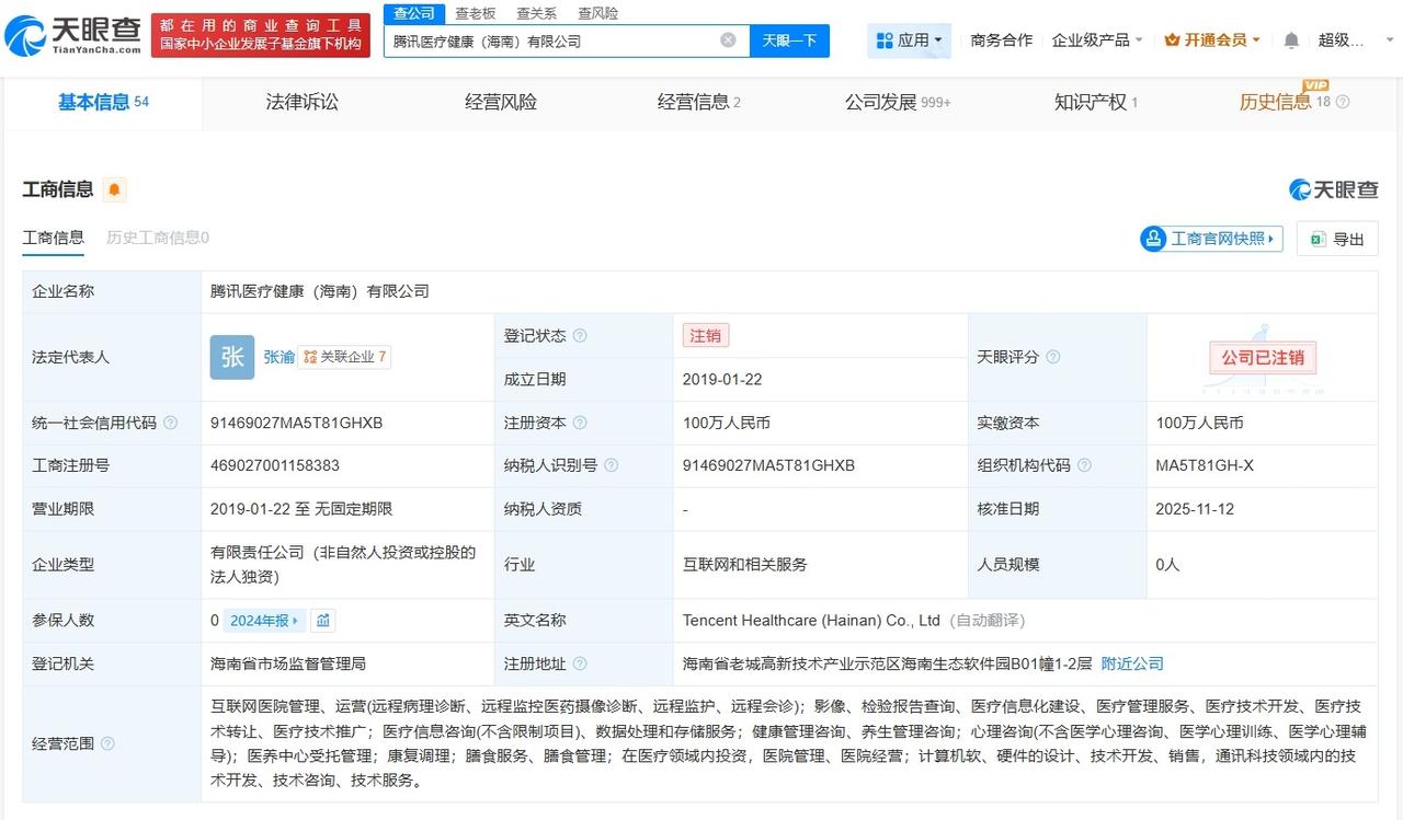 腾讯医疗健康海南公司注销 天眼查工商信息显示,近日,腾讯医疗健康(海南)有限公司登记状态由存续变更为注销。 该公司成立于2019年1月,法定代表人为张渝,注册资本100万人民币,经营范围包括互联网医院管理、运营,在医疗领域内投资,健康管理咨询等。股东信息显示,该公司由腾讯医疗健康(深圳)有限公司全资持股。 天眼查信息: