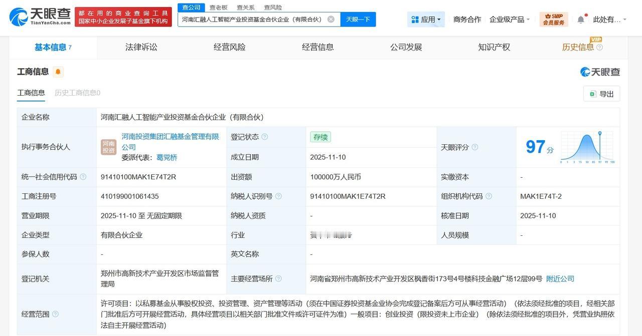 河南投资集团等成立人工智能产业基金出资额10亿 天眼查工商信息显示,近日,河南汇融人工智能产业投资基金合伙企业(有限合伙)成立,执行事务合伙人为河南投资集团汇融基金管理有限公司,出资额10亿人民币,经营范围为以私募基金从事股权投资、投资管理、资产管理等活动,创业投资。合伙人信息显示,该基金由河南投资集团汇融基金管理有限公司、郑州产投股权投资引导基金合伙企业(有限合伙)、河南省战略新兴产业投资基金有限公司等共同出资。 天眼查信息: