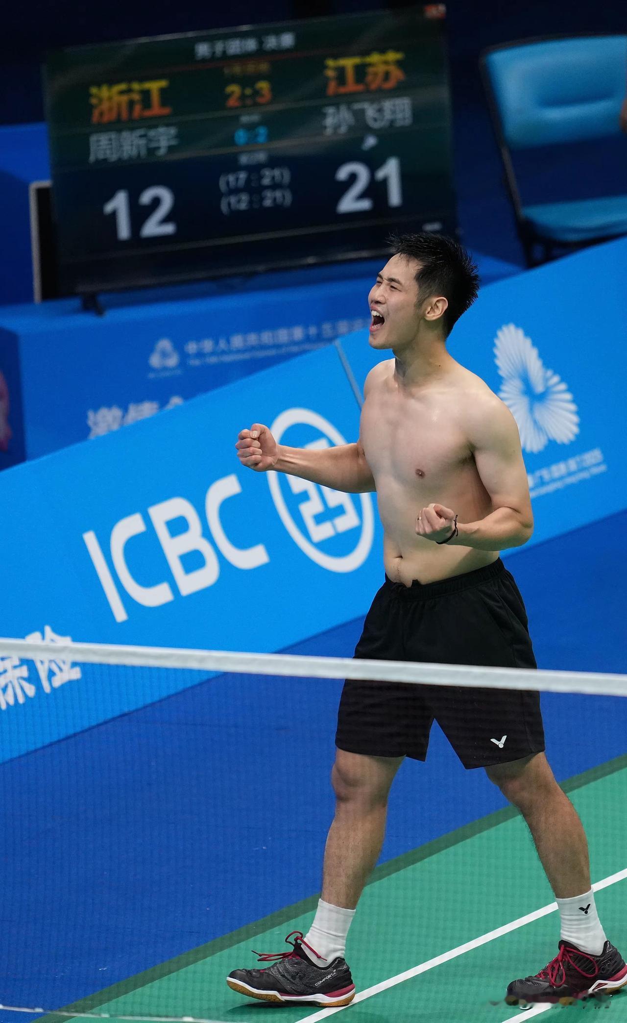 第十五届全运会羽毛球项目昨晚进行了成年组男女团体决赛,全部都是苏浙对决,两队各取一冠。率先进行的女团决赛,浙江队由陈奕诺、陈樊淑湉/吴梦莹、陈雨菲连拿三分,都没轮上奥运冠军黄雅琼登场,就直接锁定了冠军。 男团决赛要激烈得多,江苏队经过五场激战,以3-2艰难战胜浙江队,时隔16年再夺冠军。首场,石宇奇以16-21、21-17、25-23逆转险胜孙超,第二场,孙文骏/朱彦澎以25-27、18-21不敌王昶/谢浩南,关键的第三场,陆光祖以23-21、21-17力克小将胡哲安,为队伍拿到赛点,第四场,浙江队的陈旭君/郭新娃以两个21-15战胜陈柏阳/黄荻,将比赛拖入决胜场,结果,江苏队三单孙飞翔以21-17、21-12击败周新宇,为队伍锁定冠军。