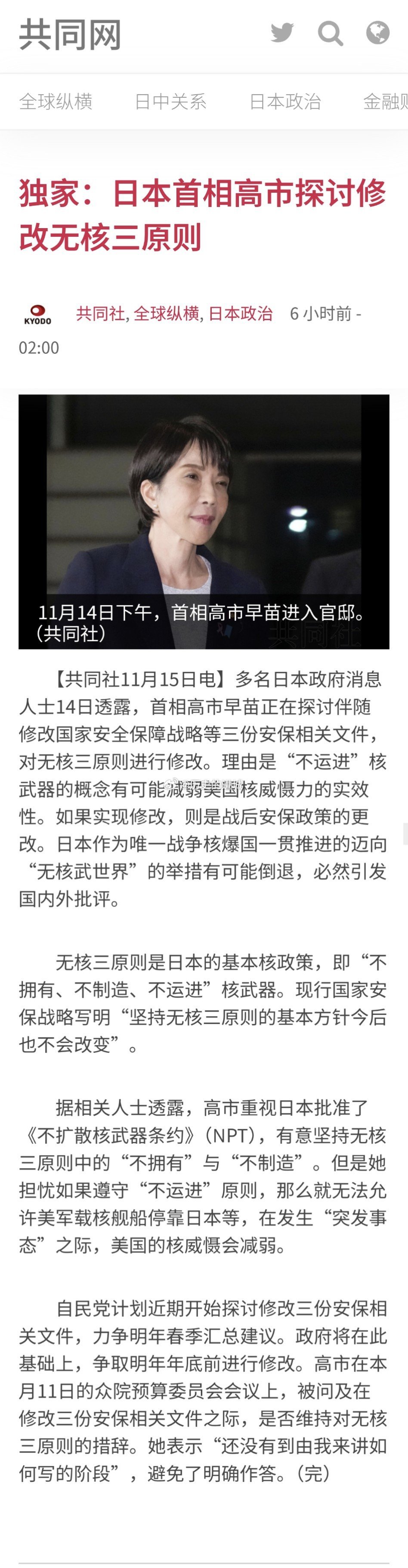 多名日本政府消息人士14日透露,首相高市早苗正在探讨伴随修改国家安全保障战略等三份安保相关文件,对无核三原则进行修改。理由是“不运进”核武器的概念有可能减弱美国核威慑力的实效性。如果实现修改,则是战后安保政策的更改。日本作为唯一战争核爆国一贯推进的迈向“无核武世界”的举措有可能倒退,必然引发国内外批评。加速了。