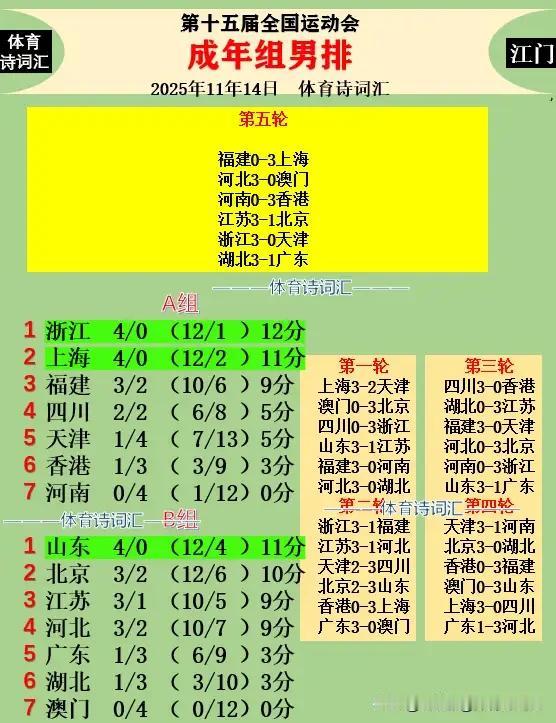 [全运会:天津男排极大概率将无缘晋级八强] 全运会成年男排赛已战罢五轮,天津成年男排在A组目前的战绩是1胜4负,积5分,排在2胜2负,积5分的四川队之后,暂列小组第五名。 天津男排还剩下一场对阵澳门队的比赛,获胜没问题,最终小组赛成绩将会定格在2胜4负积8分上。 而四川队后两场比赛,将分别对阵小组第三的福建队和排名垫底、一场不胜的河南队。四川队只要任意一场取胜,就将小组出线,晋级八强。 从态势、后程比赛和硬实力来看,四川男排大概率晋级八强,而来自排球之城的天津男排,将八强不入,无缘晋级。 这样随着天津U18男排未能组队报名参加全运会资格赛, U20男排在全运会最终成绩排名第九, 成年男排又八强不入,排球之城男排在全运会的比赛,就提前宣告结束了。 天津男排