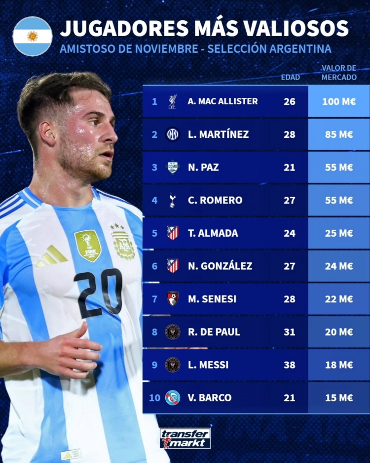 直播吧11月15日讯德国转会市场统计了本期阿根廷队名单的球员身价,麦卡利斯特1亿欧居首,梅西1800万欧排名第9位。