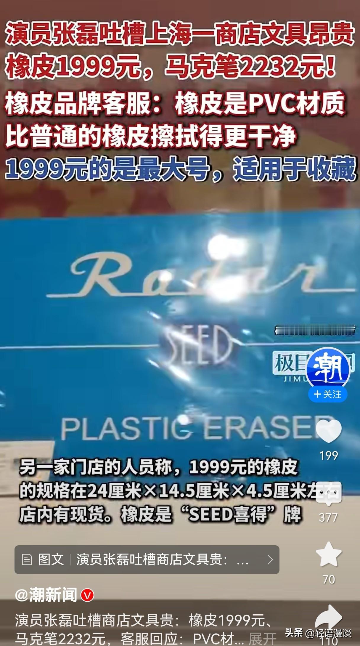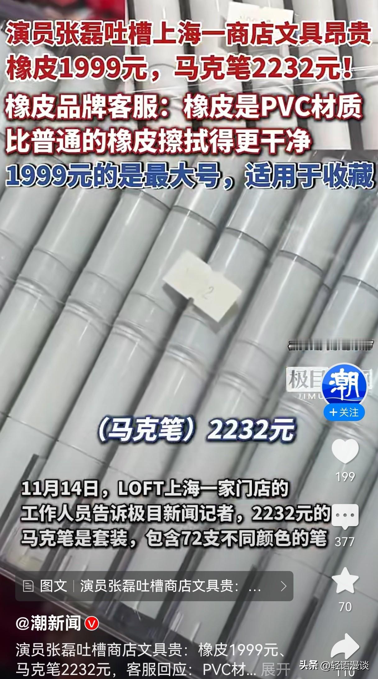 这“沉浸式体验”, 确实到位,瞬间让你人间清醒。 “灵魂橡皮”卖1999元, “黄金马克笔”卖 2232元一盒! 演员张磊吐槽这马克笔堪比金条。 网友:“这哪是擦错题,是擦光银行卡!” 客服淡定解释:这是品牌最大号橡皮,PVC材质,适用于收藏。 懂了, 这 24厘米长的大橡皮,擦的不是铅笔印, 还能擦掉半本人生的错误。 简单的人生感悟 马克笔用品文具
