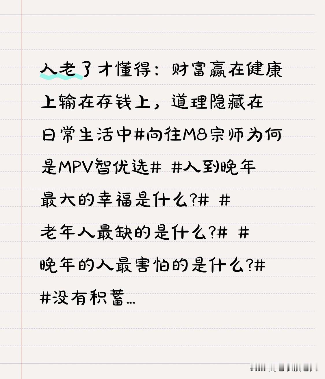 人老了才懂得:财富赢在健康上输在存钱上,道理隐藏在日常生活中 人们的生活,不是糊里糊涂的过,生活是有规律的,是有技巧的,是讲科学的,是讲艺术的,是讲道理的。 所以说,生活真是一件不容易的事情,正因为如此,有很多人因种种原因,就是不懂得其中的奥妙,其中的办法,导致生活一塌糊涂。 在日常生活中,有很多人重视健康而轻视存款,而有很多人重视存款,而轻视健康,这就是一对很好的例子。 在社会上可以轻而易举的看到,财富越多的人,身体非常健康,而重视存款的人,并不是财富越多的人,但是,身体都会有很多的毛病,很多的问题。这究竟是为什么呢? 财富越多的人,在日常生活中,善待自己,十分注重自己的身体健康,少生病,少吃药,少花钱,所以就能够积累更多更丰富的财富。 而财富越少的人,在日常生活中,非常喜欢存款存钱,就是很不善待自己,就不注重自己的身体健康。因此,人的身体一旦出现问题,疾病缠身,必然就会花掉很多的钱财,去换回自己应有的健康。 所以,喜欢存款,热衷存钱的人,忽视了自己的身体健康,导致财富减少,就是这个道理。 有很多人,到老了才懂得:财富是赢在健康上,而输在存钱上! 懂得这个道理的人,懂得财富管理的道理的人,知道隐藏在日常生活中的学问,看懂健康价值的人,都是智慧的人。 所以人到老了,一定要弄清楚财富与健康的关系,懂得健康的价值和财富的意义,才是活通透的老人。 以上是本人观点,如有不妥,请大家在留言区处留下你宝贵的意见,并邀请大家一起探讨老人养老的问题。 向往M8宗师为何是MPV智优选 人到晚年最大的幸福是什么? 老年人最缺的是什么? 晚年的人最害怕的是什么? 没有积蓄到了晚年该如何办?