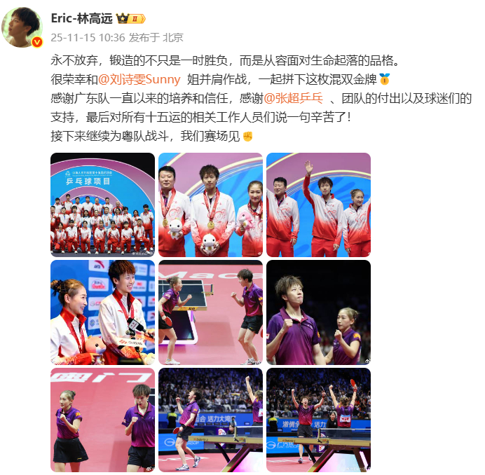2025全运会乒乓球混双金牌赛,林高远/刘诗雯4-2战胜陈垣宇/蒯曼,收获冠军 :永不放弃,锻造的不只是一时胜负,而是从容面对生命起落的品格。很荣幸和 姐并肩作战,一起拼下这枚混双金牌🥇感谢广东队一直以来的培养和信任,感谢 、团队的付出以及球迷们的支持,最后对所有十五运的相关工作人员们说一句辛苦了!接下来继续为粤队战斗,我们赛场见✊