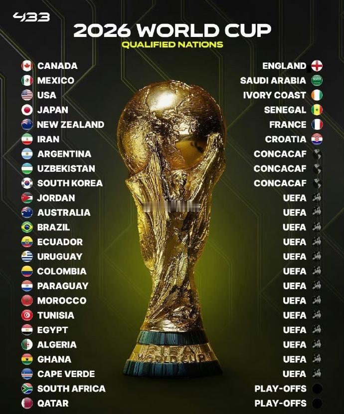 克罗地亚3-1击败法罗群岛,提前一轮晋级世界杯。他们是第30支确定晋级的队伍,也是欧洲区第3队。已晋级2026世界杯队伍:中北美及加勒比:美国、墨西哥、加拿大南美:阿根廷、巴西、厄瓜多尔、乌拉圭、巴拉圭、哥伦比亚亚洲:日本、伊朗、乌兹别克斯坦、韩国、约旦、澳大利亚、卡塔尔、沙特非洲:摩洛哥、突尼斯、埃及、阿尔及利亚、加纳、佛得角、南非、科特迪瓦、塞内加尔大洋洲:新西兰欧洲:英格兰、法国、克罗地亚 参加跨洲附加赛队伍:新喀里多尼亚、玻利维亚