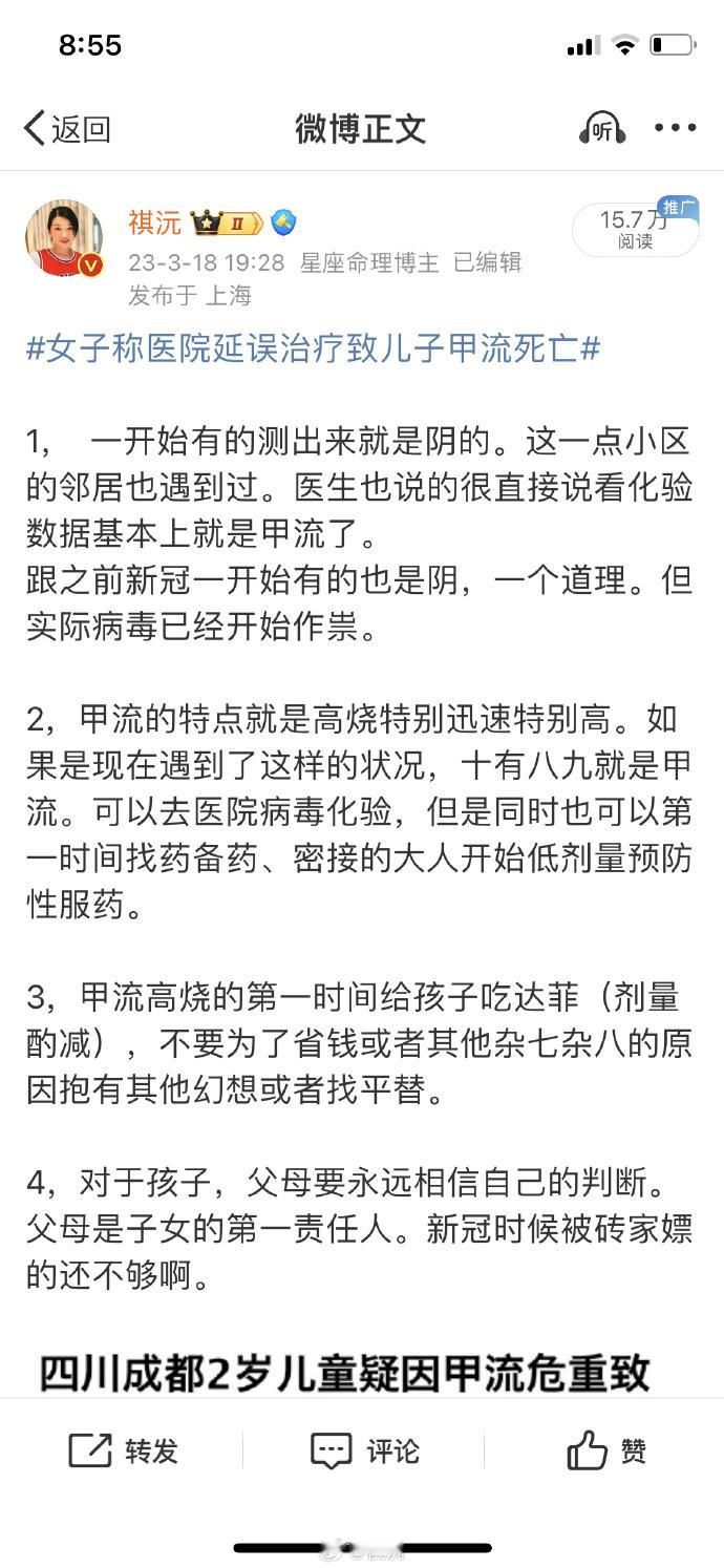 流感死孩子,不是新闻了。是23年的旧闻。父母是孩子的第一责任人,父母要迅速反应、更新认知,有效行动、部署自己,保护好自己和自己所爱的家人。