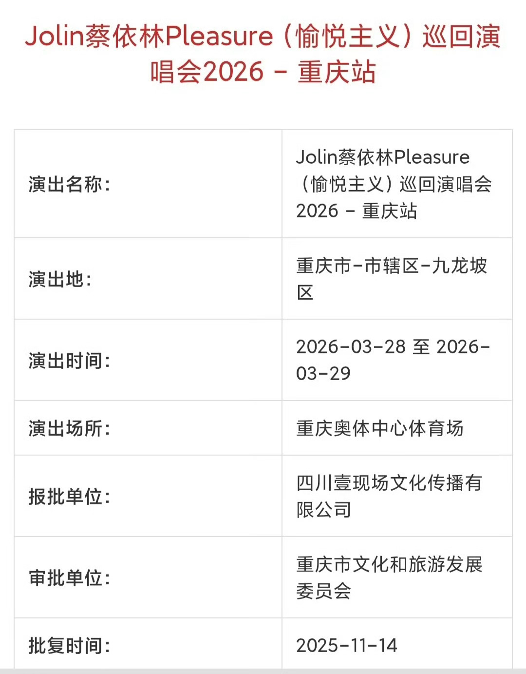 蔡依林2026年愉悦主义巡回演唱会重庆站报批通过,03/28-03/29,重庆奥体中心。
